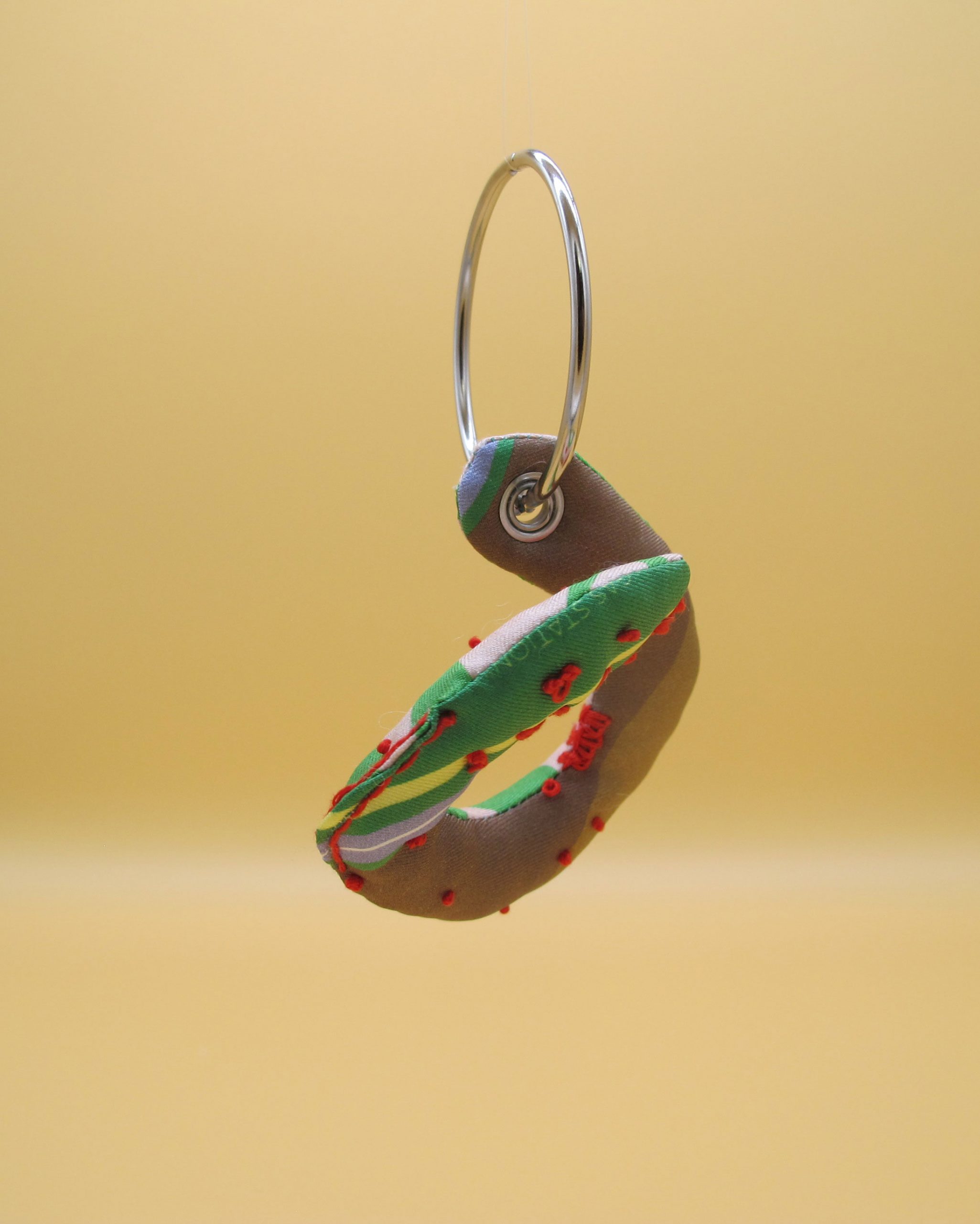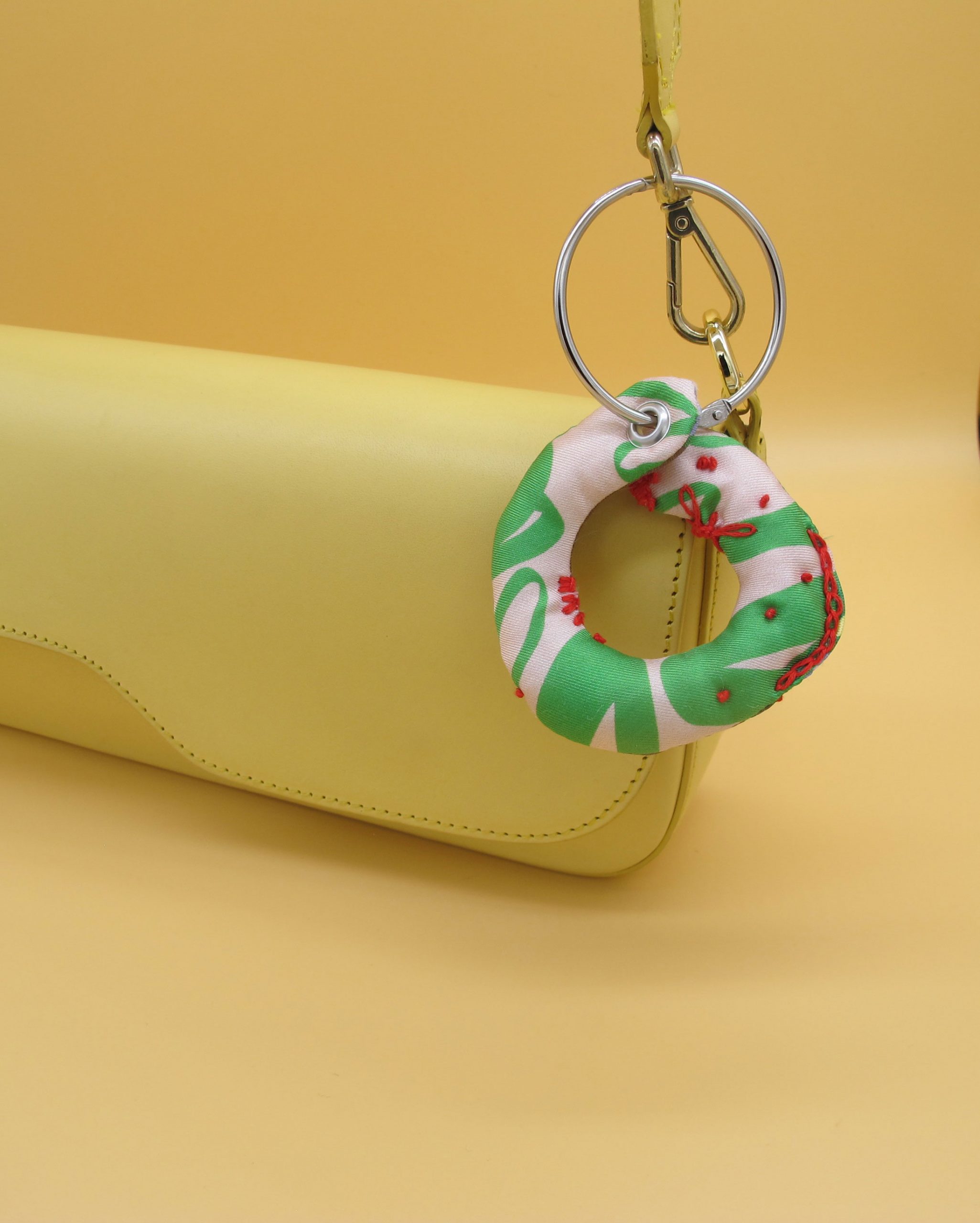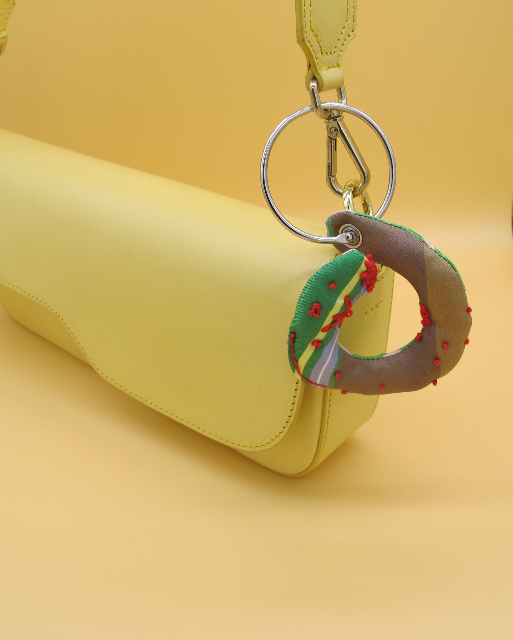“Bag Charm” is hand made of repurposed hnyHANY silk twill foulards. This little friend for your hand bag was hand sewn, stuffed with soft wadding and hand embroidered in Berlin. Every piece is unique.