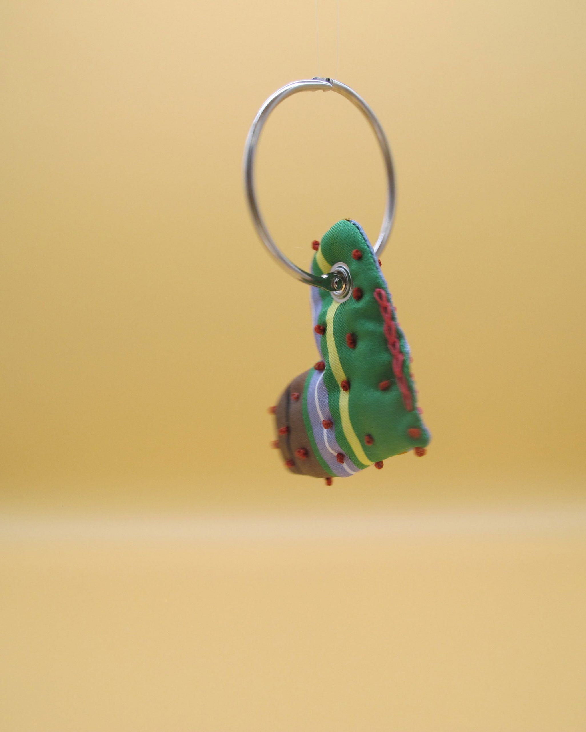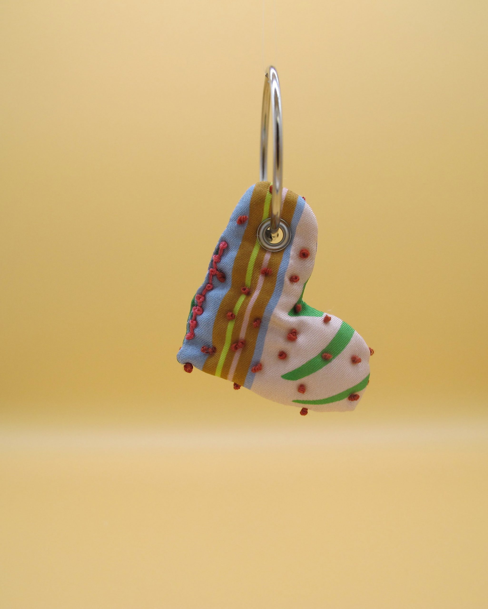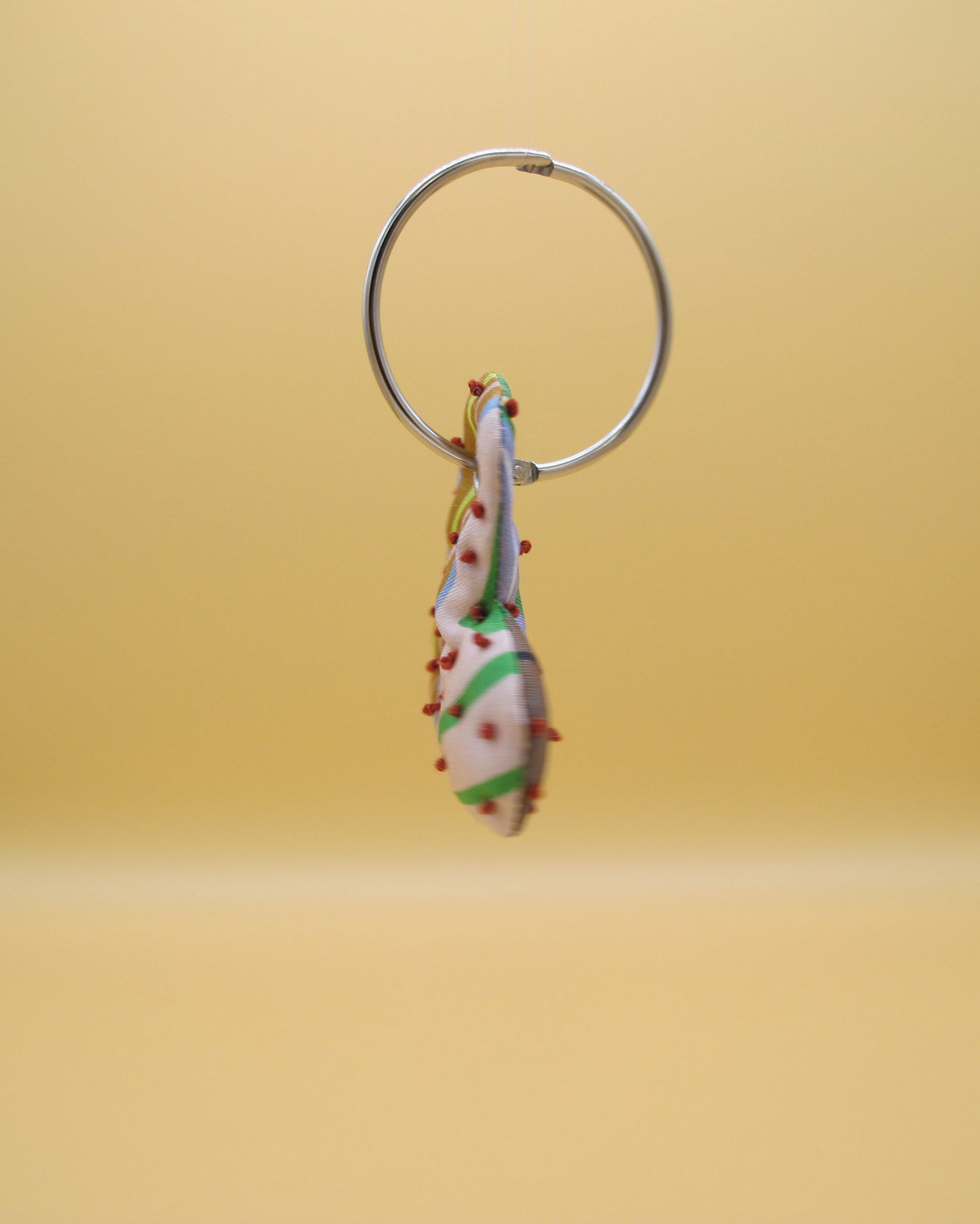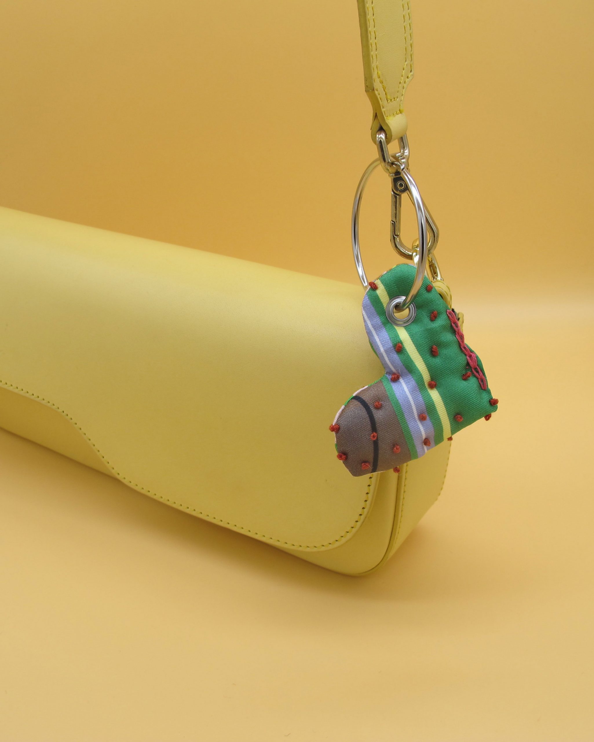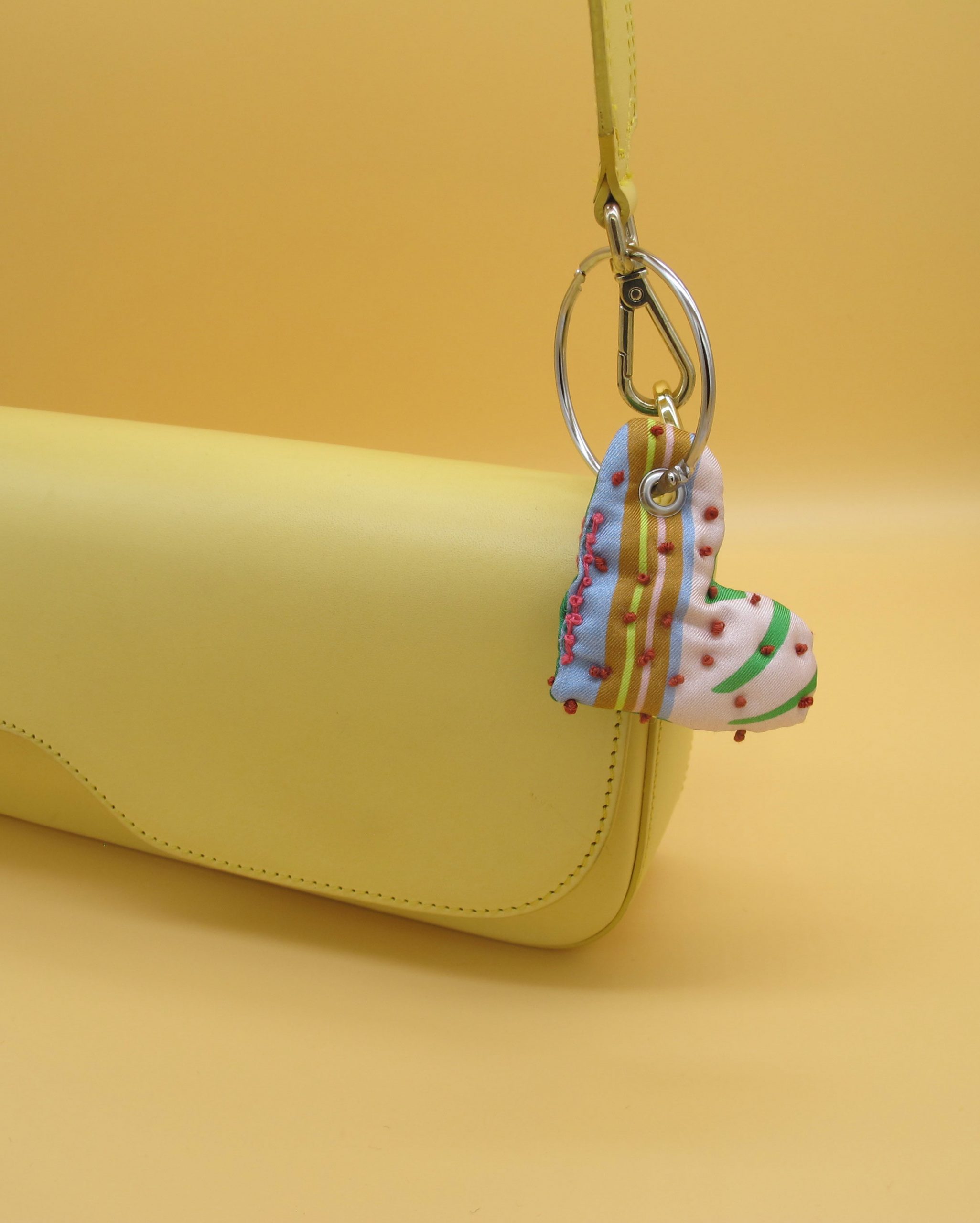 “Bag Charm” is hand made of repurposed hnyHANY silk twill foulards. This little friend for your hand bag was hand sewn, stuffed with soft wadding and hand embroidered in Berlin. Every piece is unique.