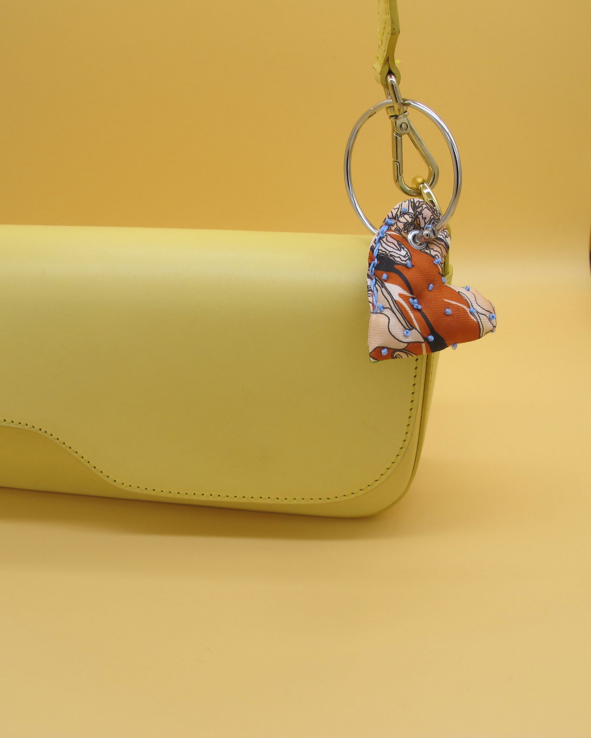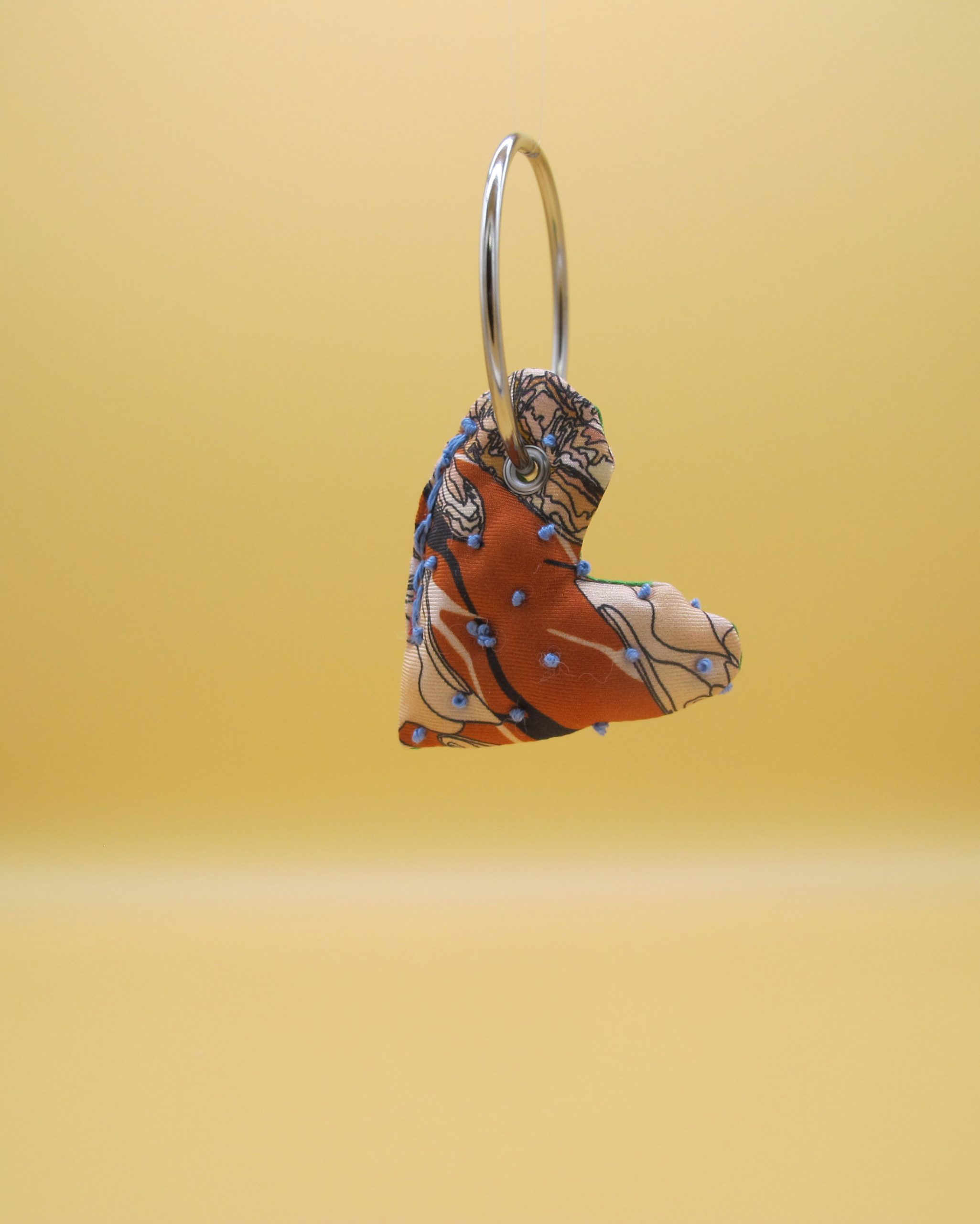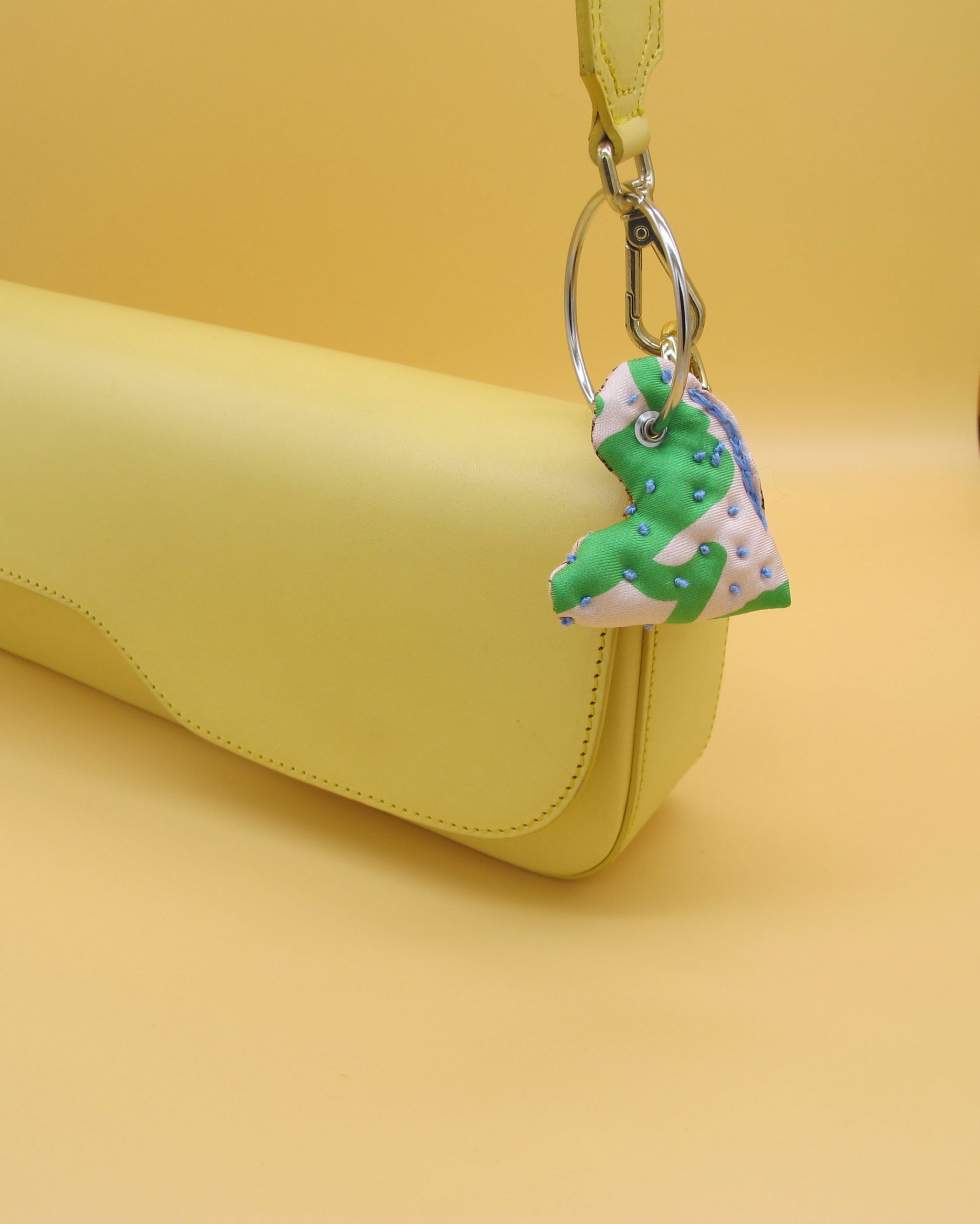 “Bag Charm” is hand made of repurposed hnyHANY silk twill foulards. This little friend for your hand bag was hand sewn, stuffed with soft wadding and hand embroidered in Berlin. Every piece is unique.