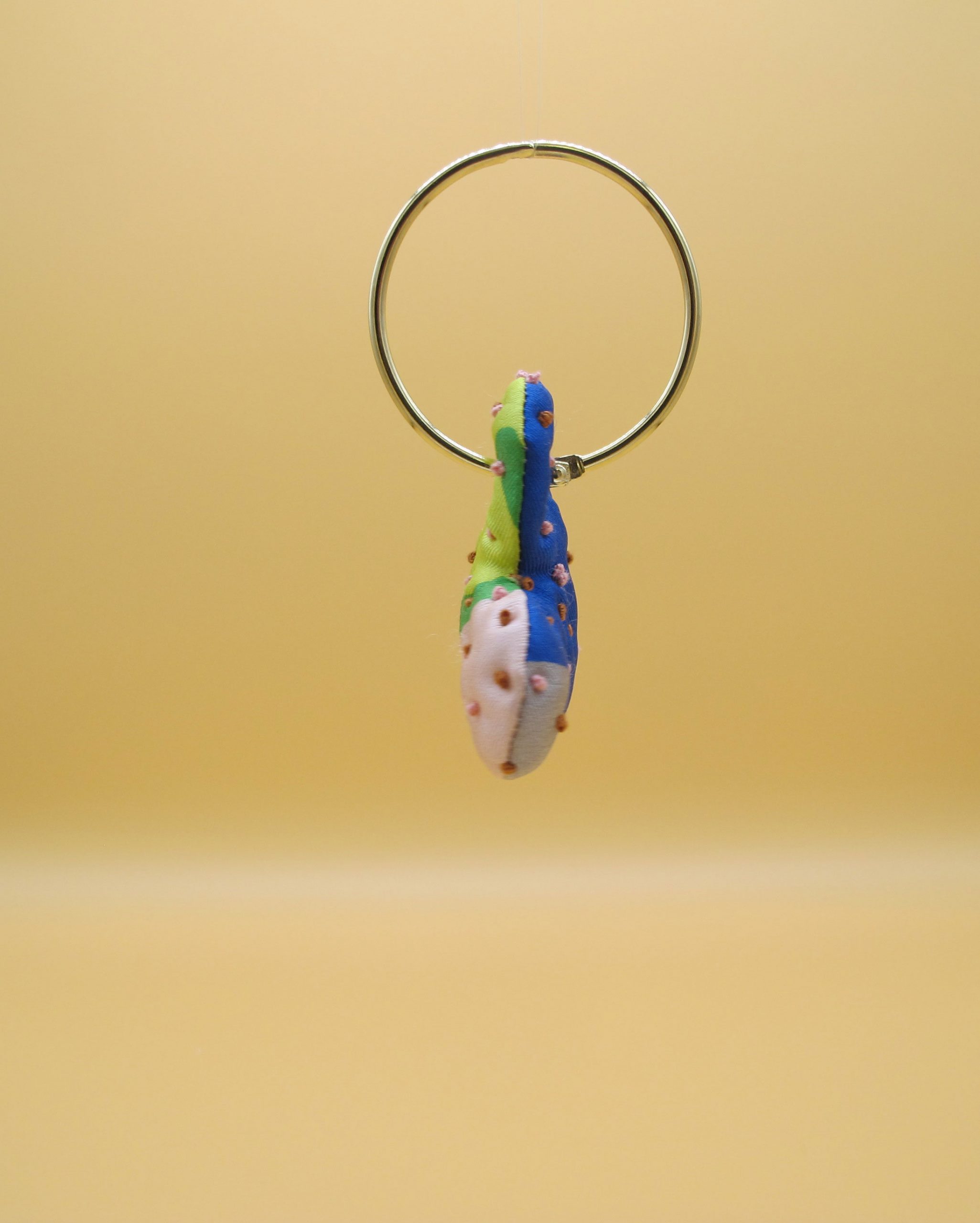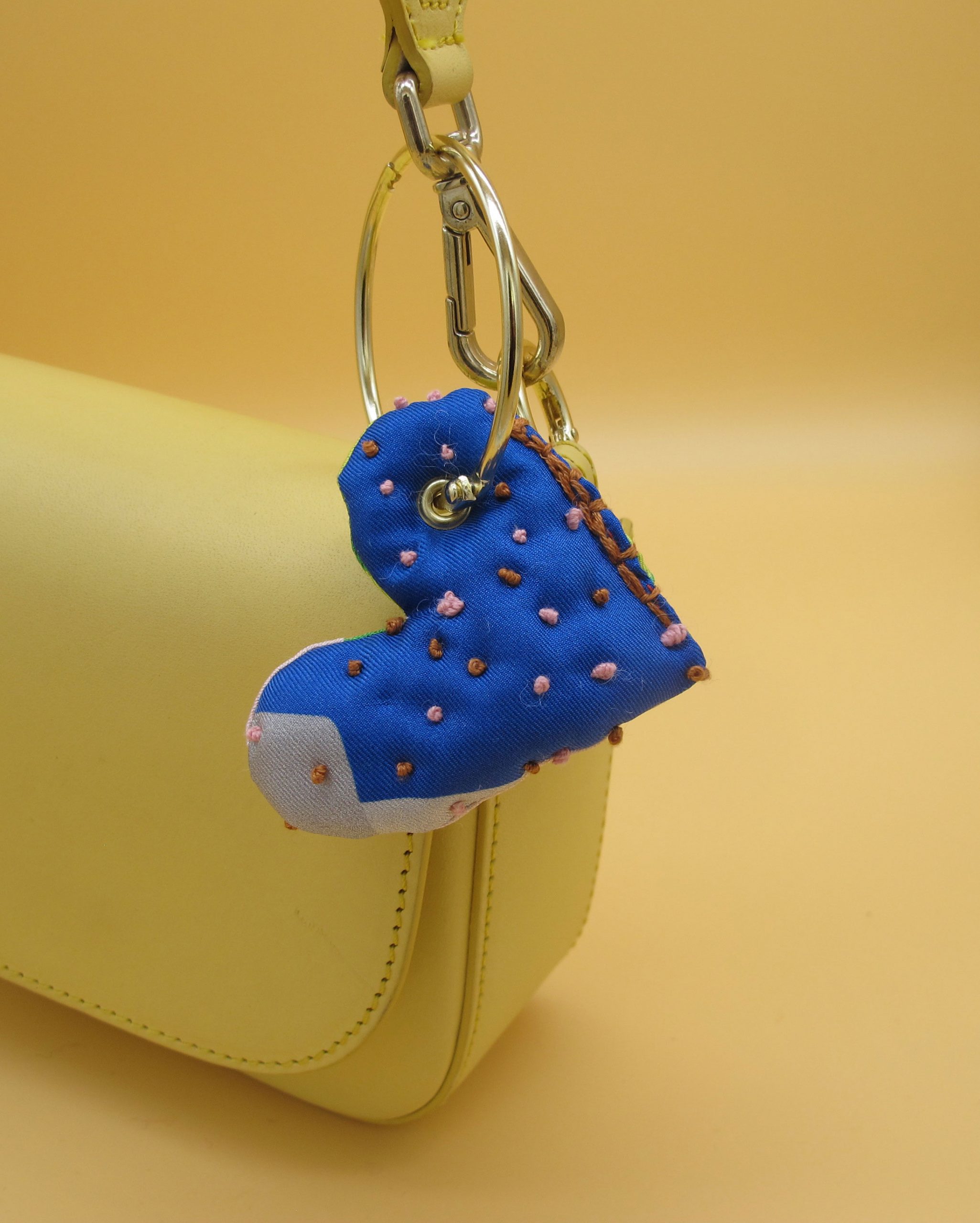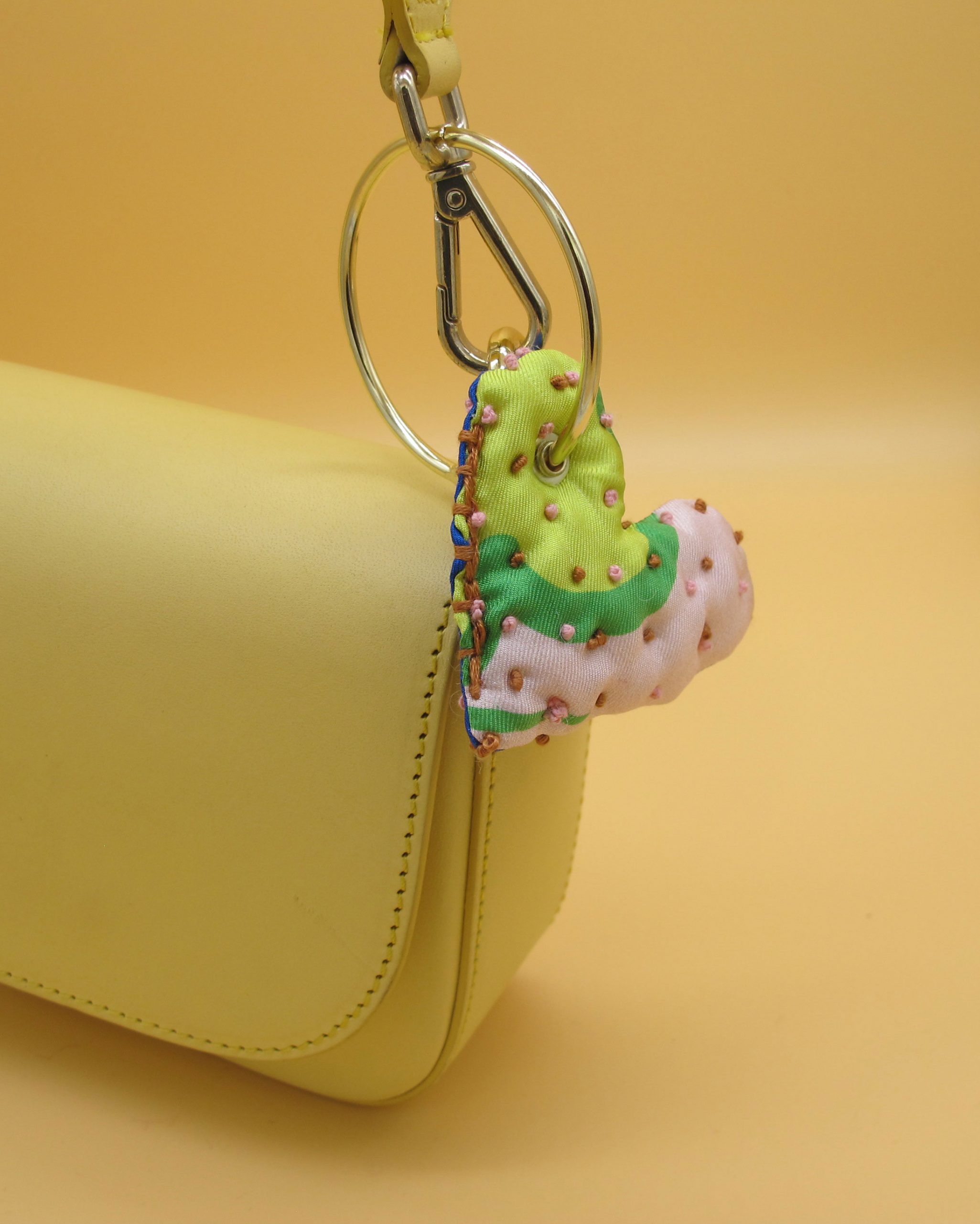 “Bag Charm” is hand made of repurposed hnyHANY silk twill foulards. This little friend for your hand bag was hand sewn, stuffed with soft wadding and hand embroidered in Berlin. Every piece is unique.