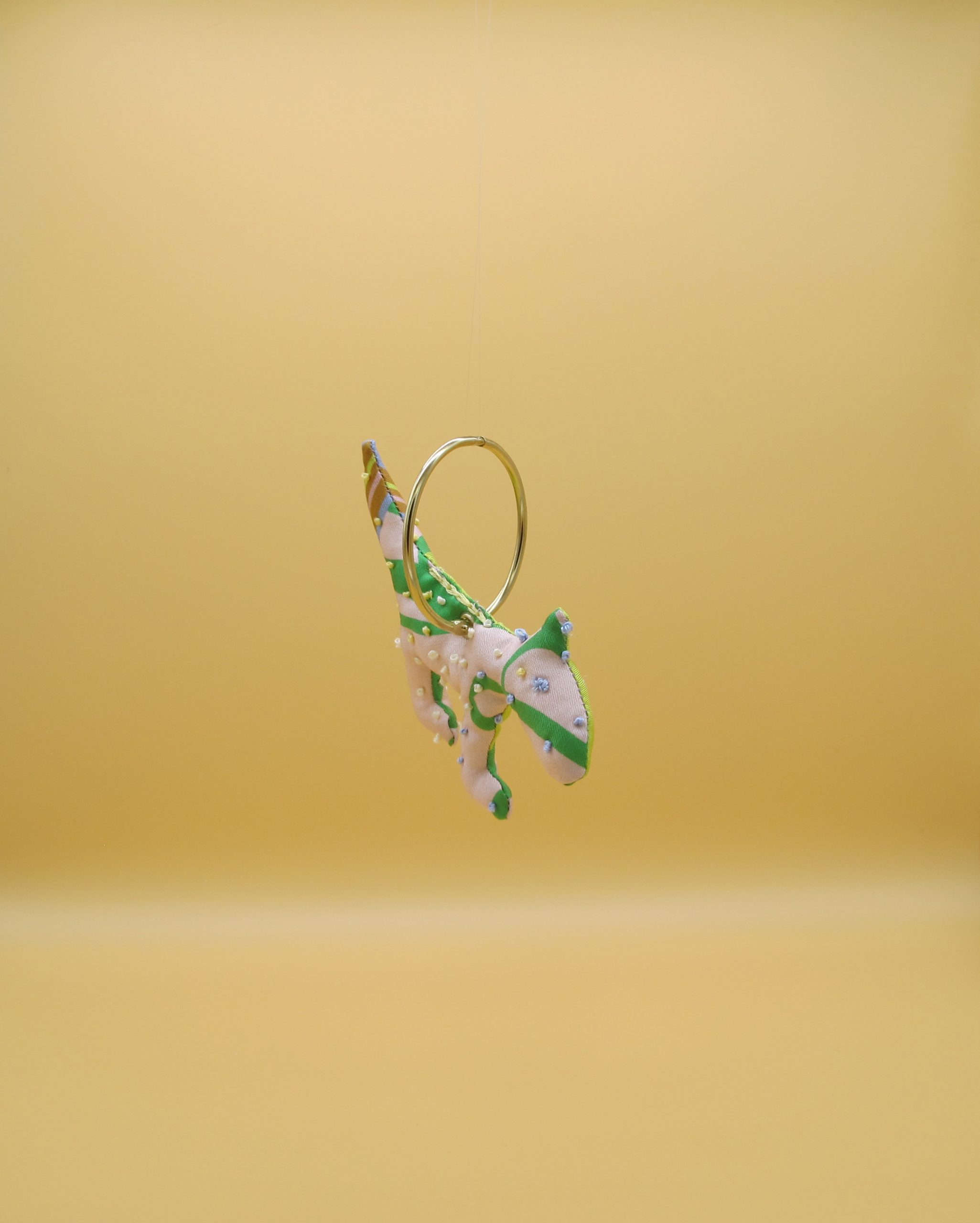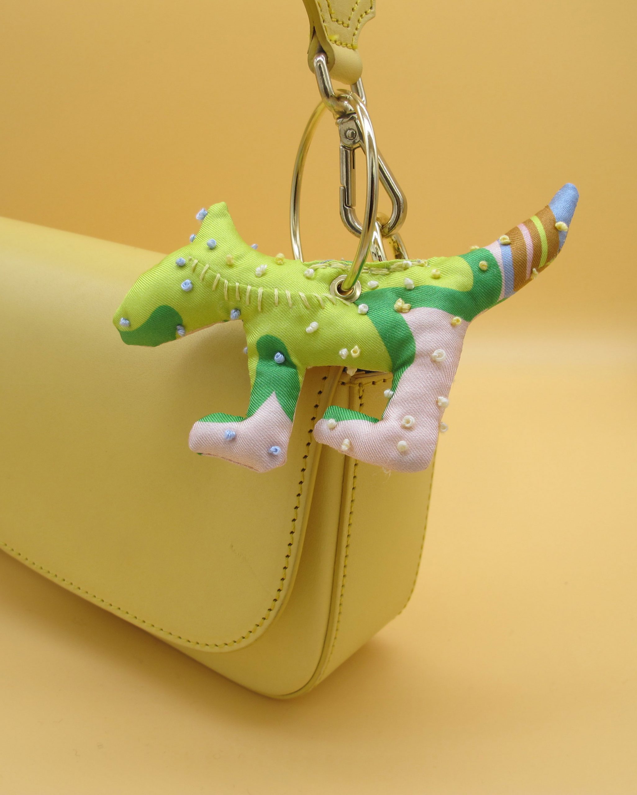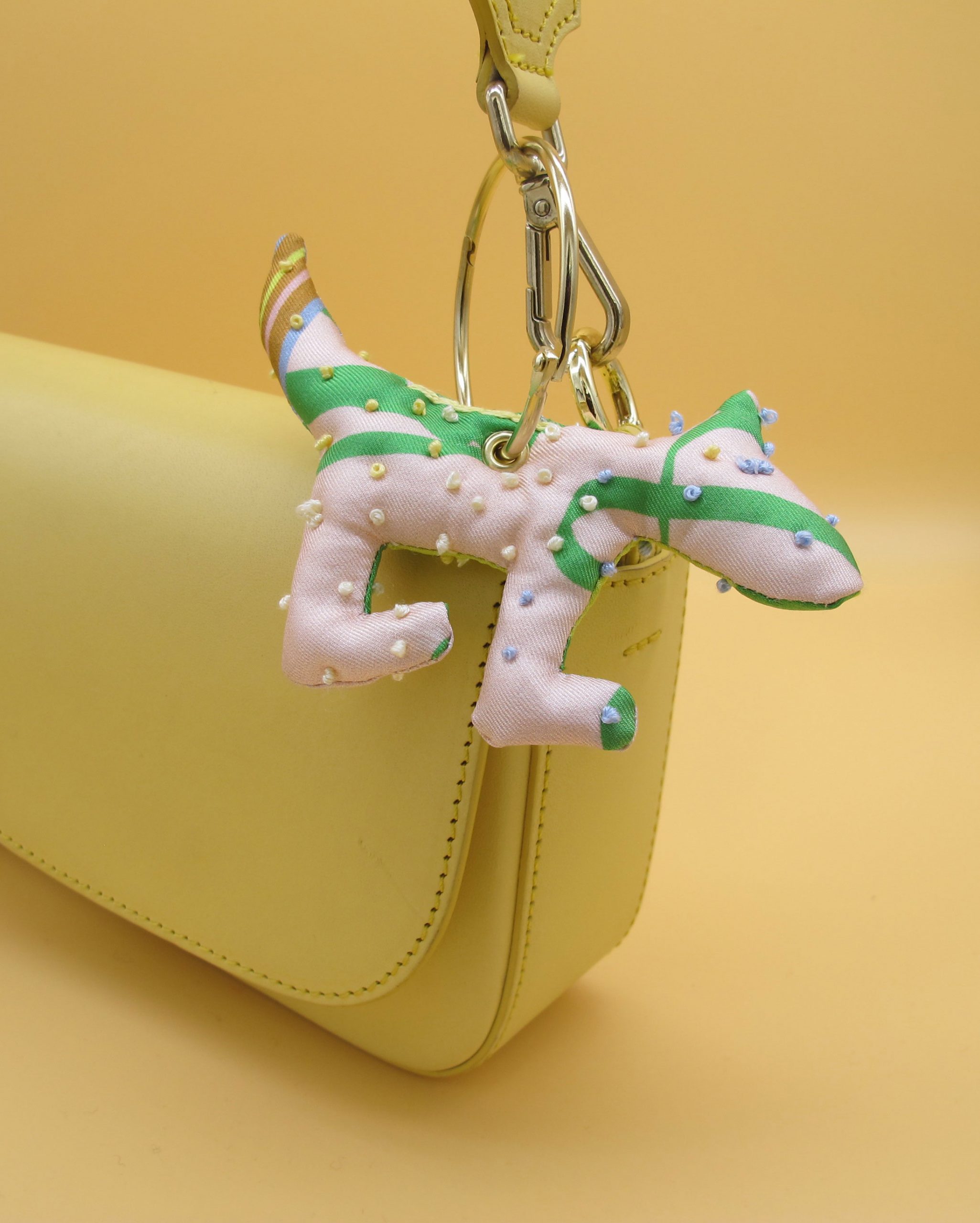 “Bag Charm” is hand made of repurposed hnyHANY silk twill foulards. This little friend for your hand bag was hand sewn, stuffed with soft wadding and hand embroidered in Berlin. Every piece is unique.