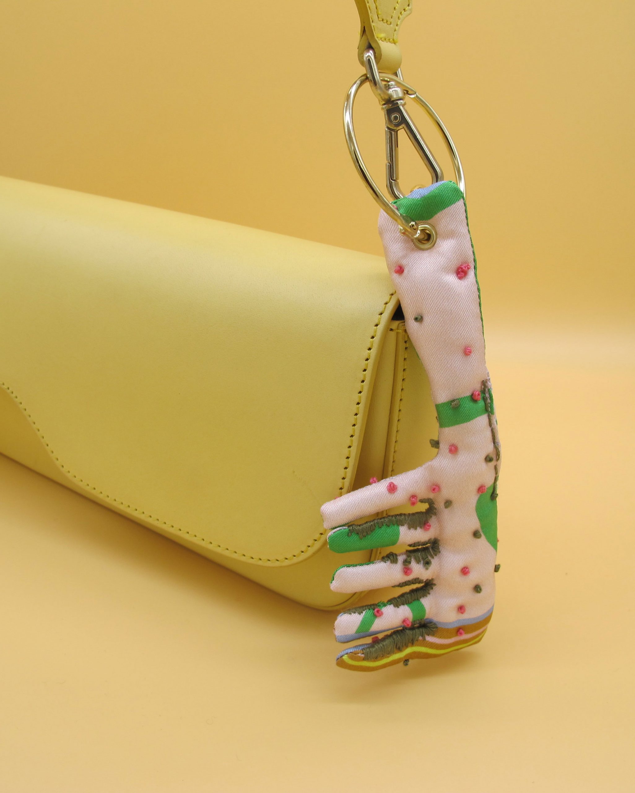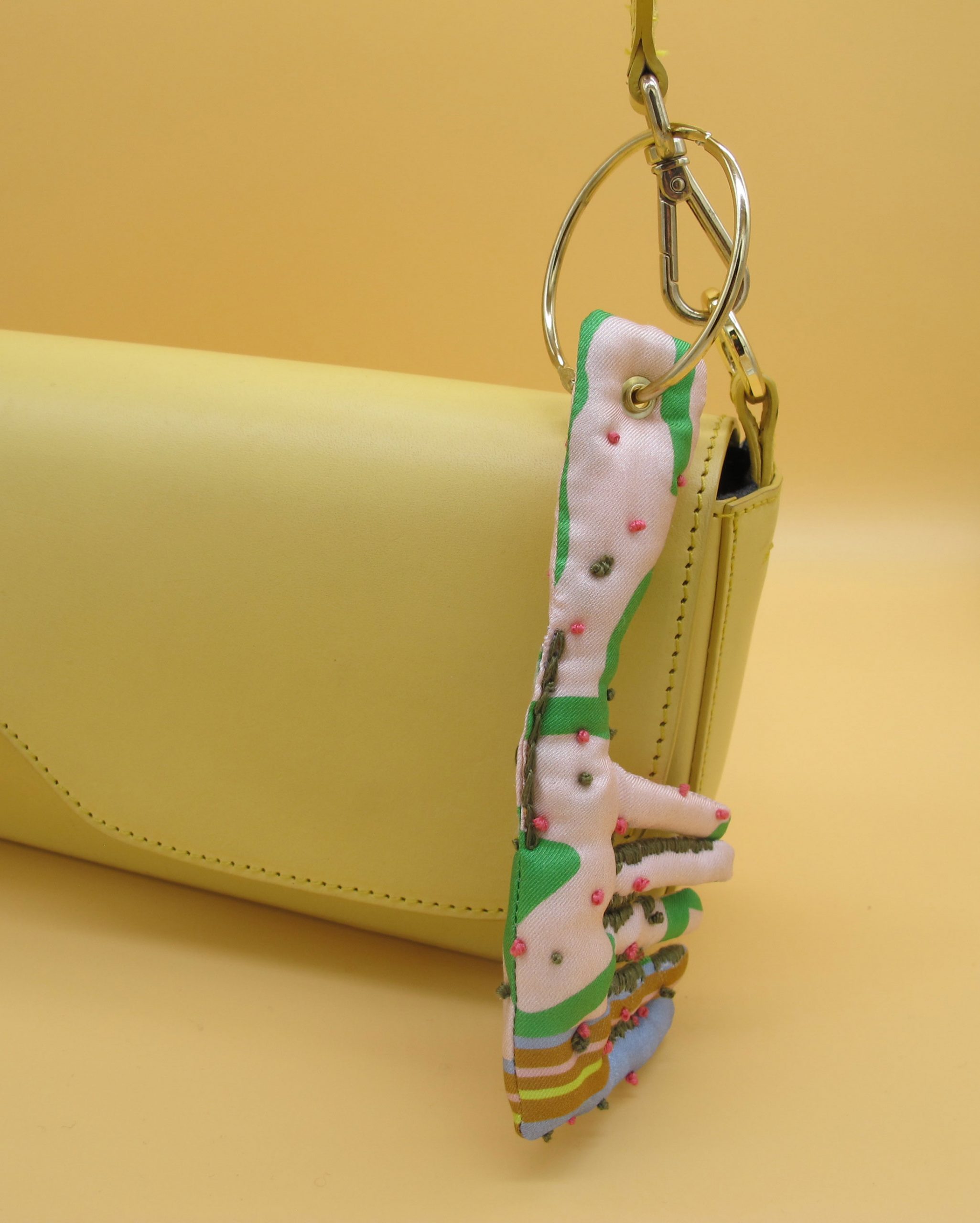 “Bag Charm” is hand made of repurposed hnyHANY silk twill foulards. This little friend for your hand bag was hand sewn, stuffed with soft wadding and hand embroidered in Berlin. Every piece is unique.