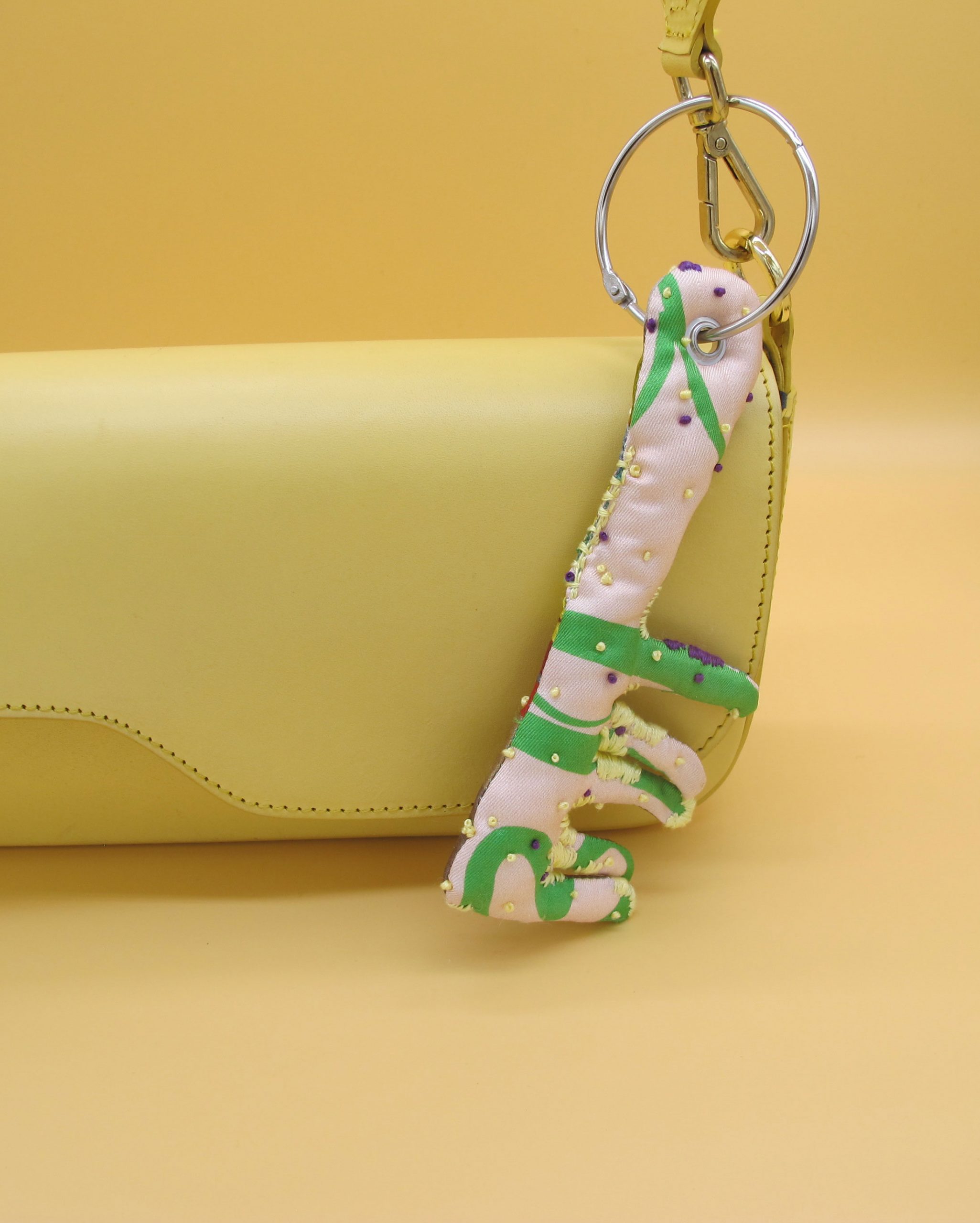 “Bag Charm” is hand made of repurposed hnyHANY silk twill foulards. This little friend for your hand bag was hand sewn, stuffed with soft wadding and hand embroidered in Berlin. Every piece is unique.