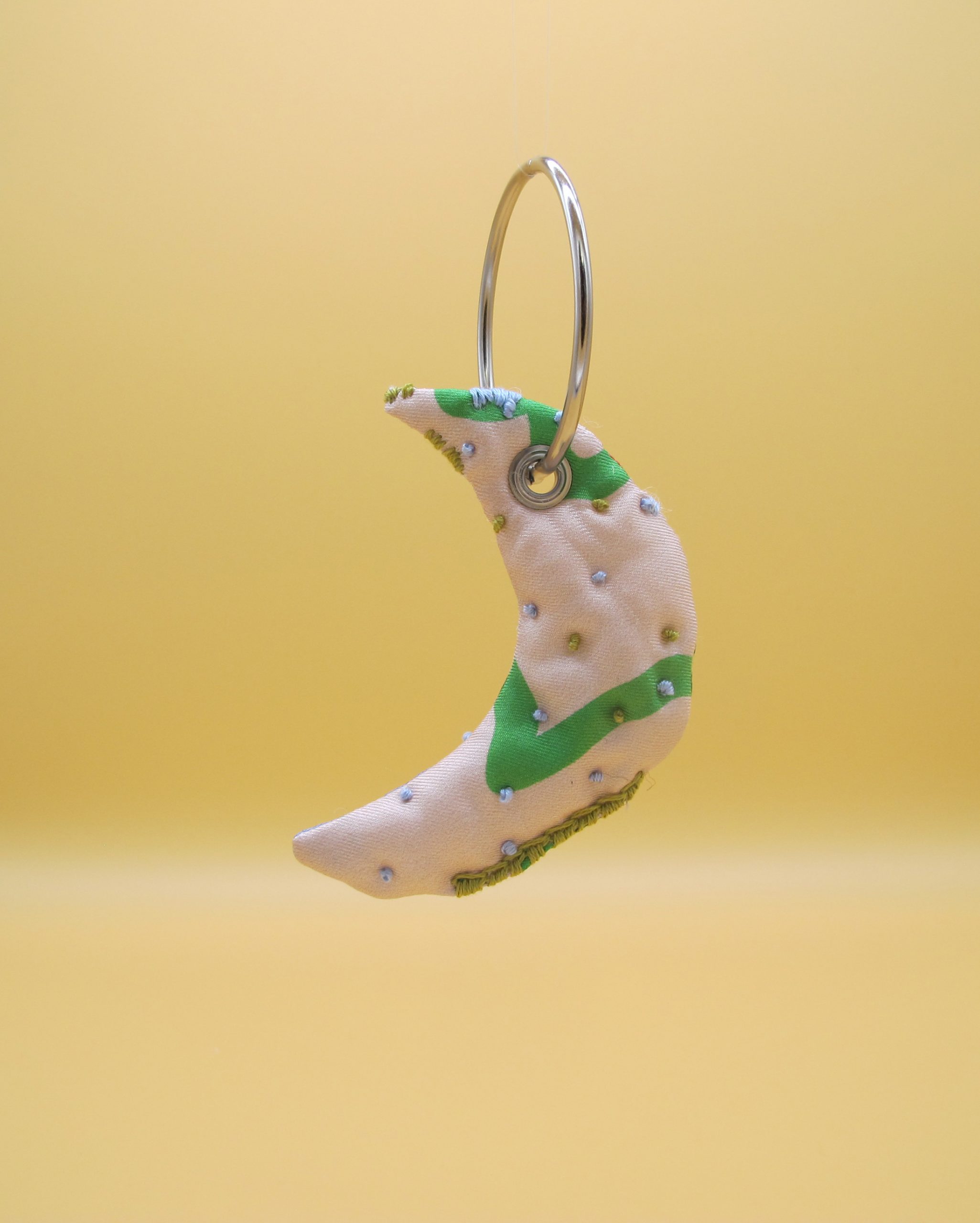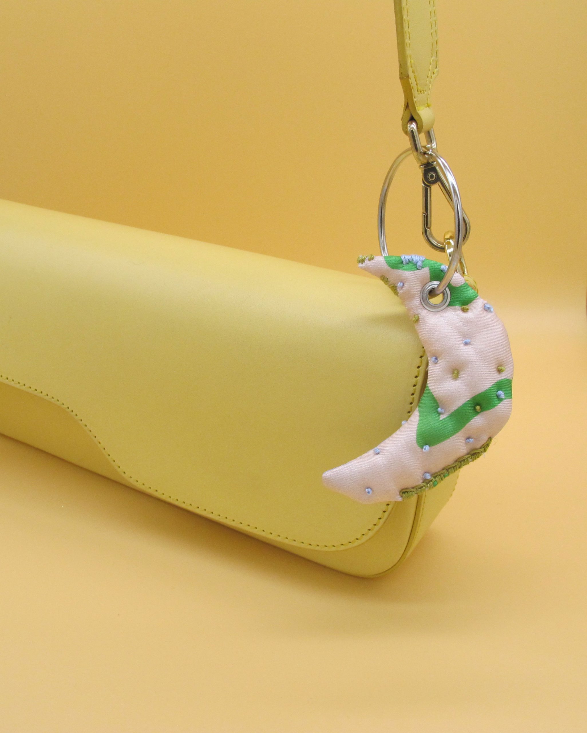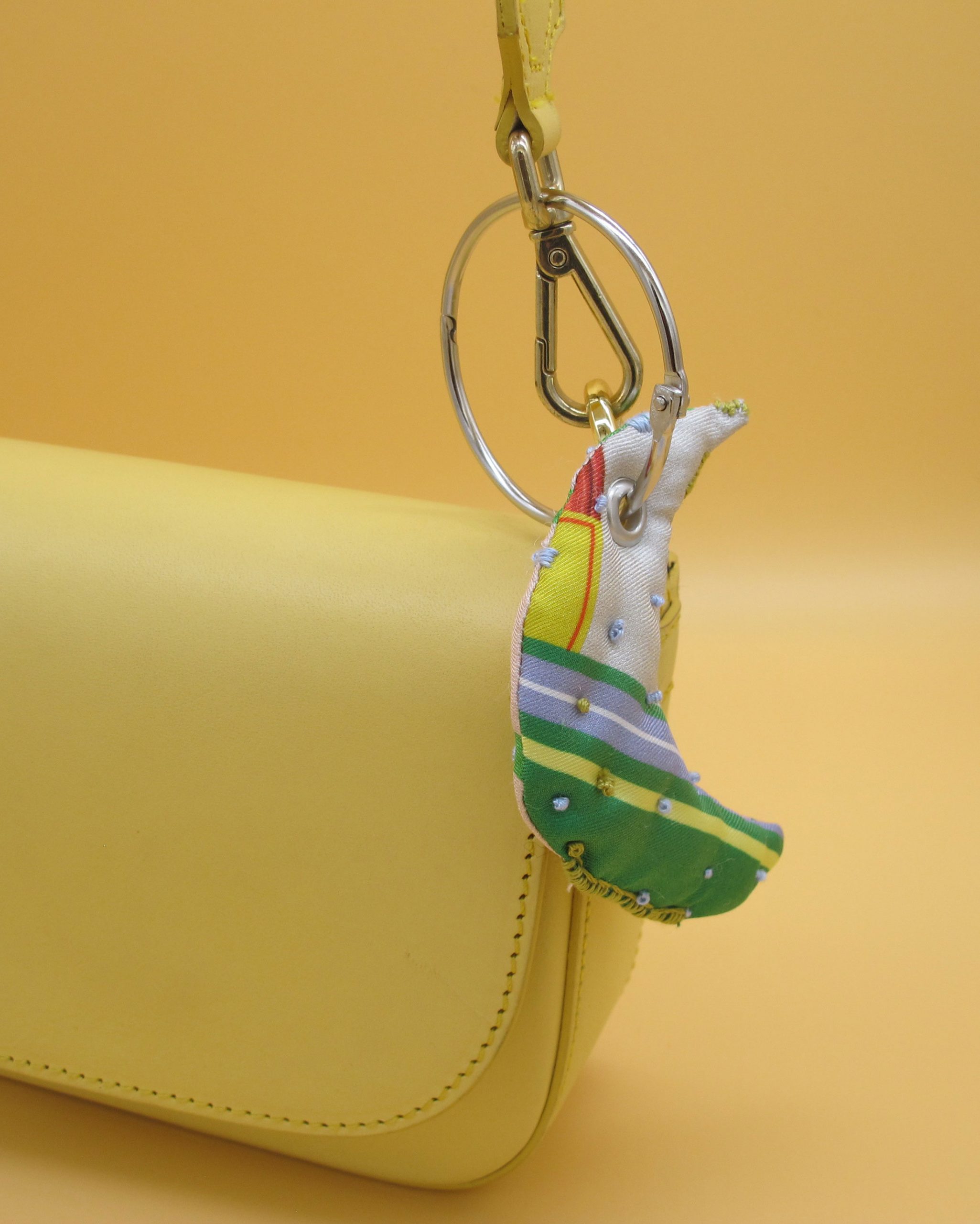 “Bag Charm” is hand made of repurposed hnyHANY silk twill foulards. This little friend for your hand bag was hand sewn, stuffed with soft wadding and hand embroidered in Berlin. Every piece is unique.