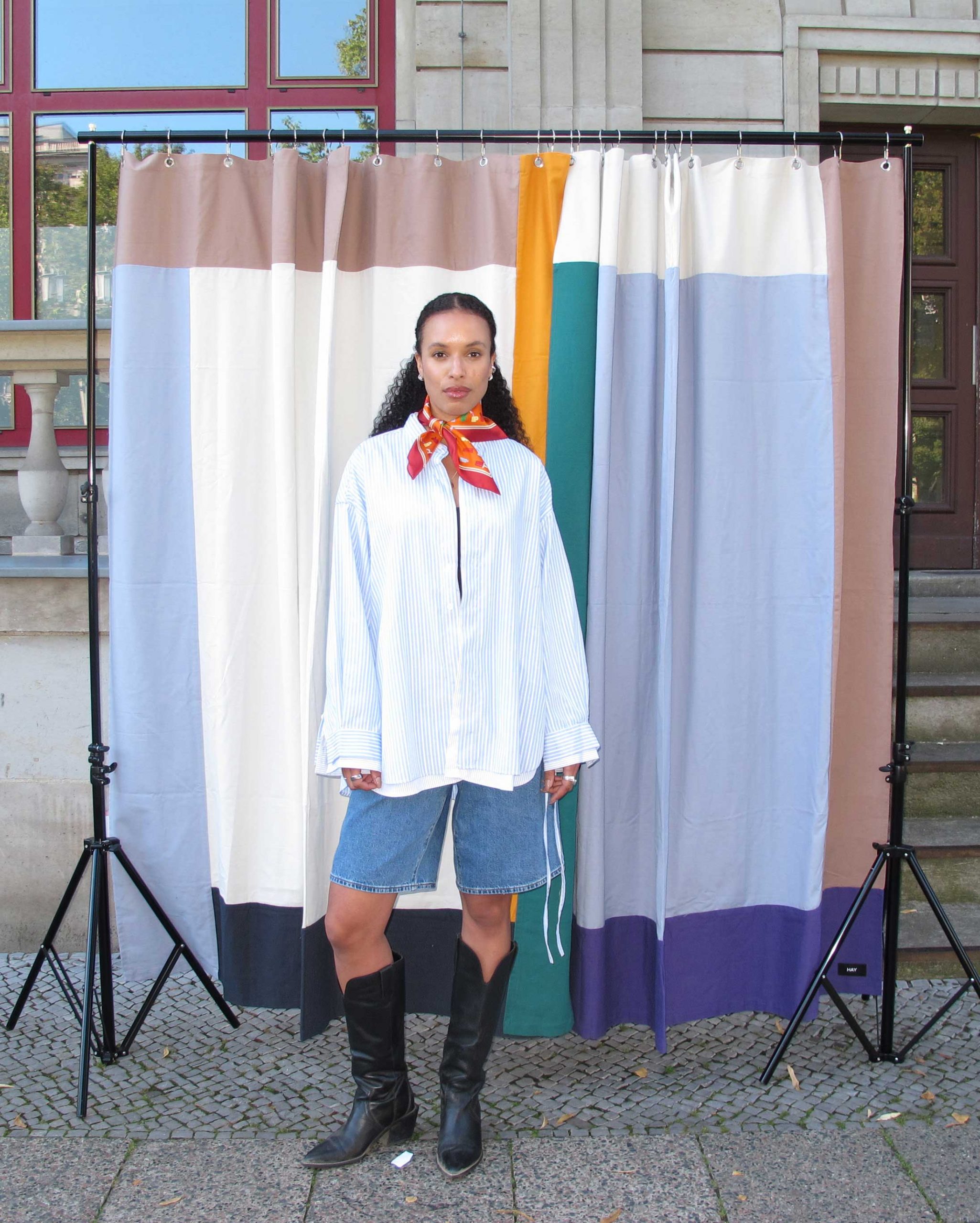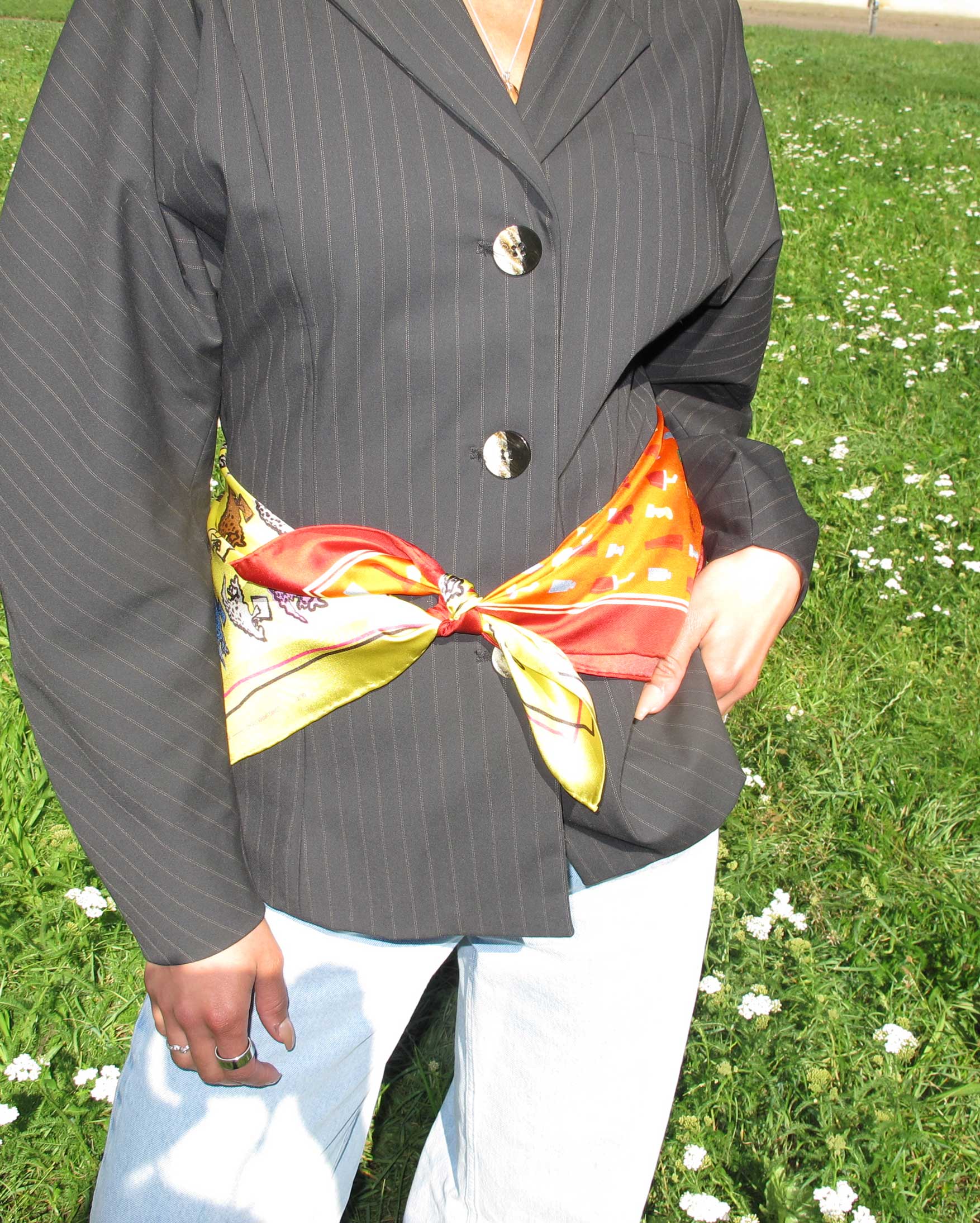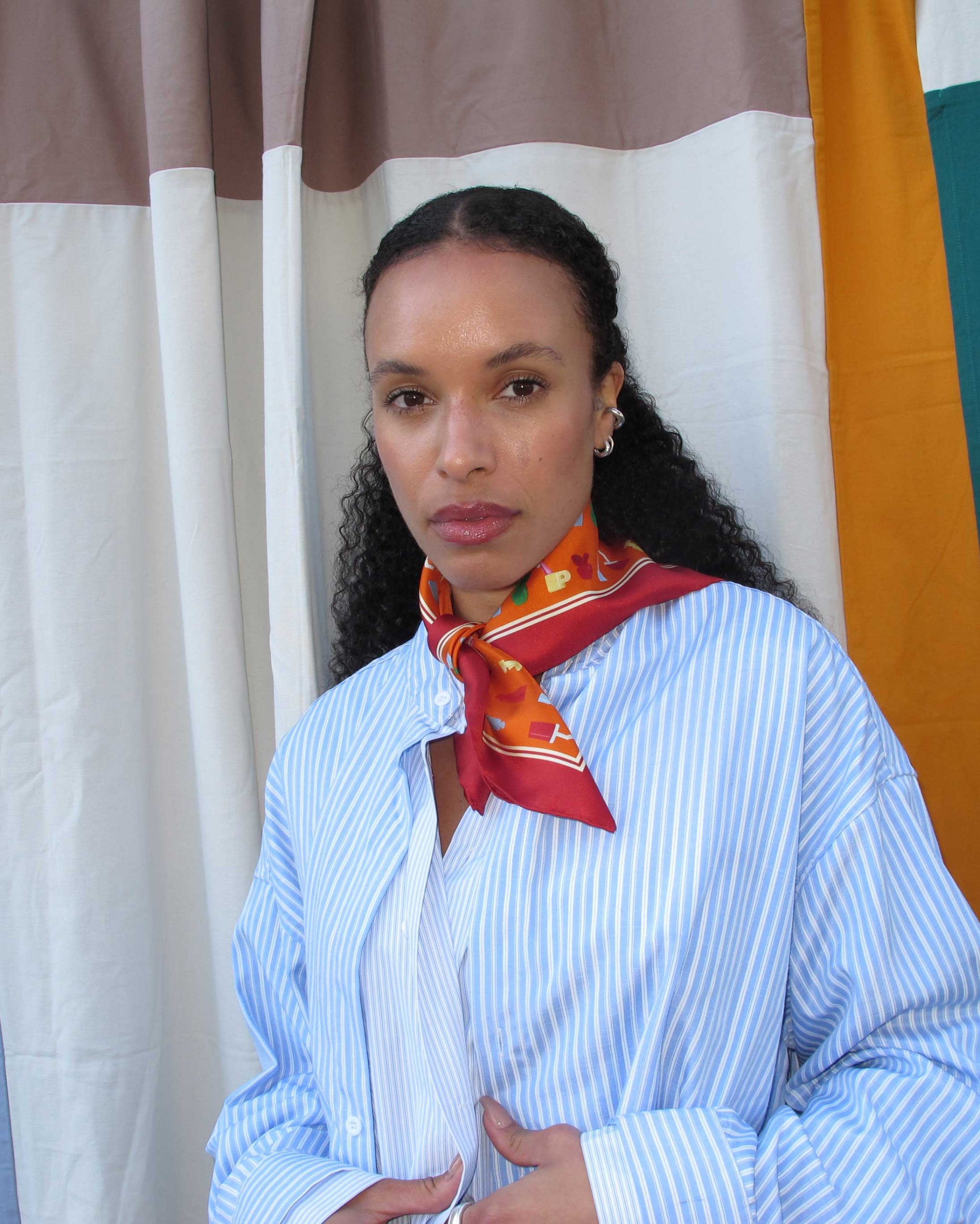 “Square 50×50” is a rectangular silk scarf made of silk twill featuring the Small Orange Plastic Toys print.