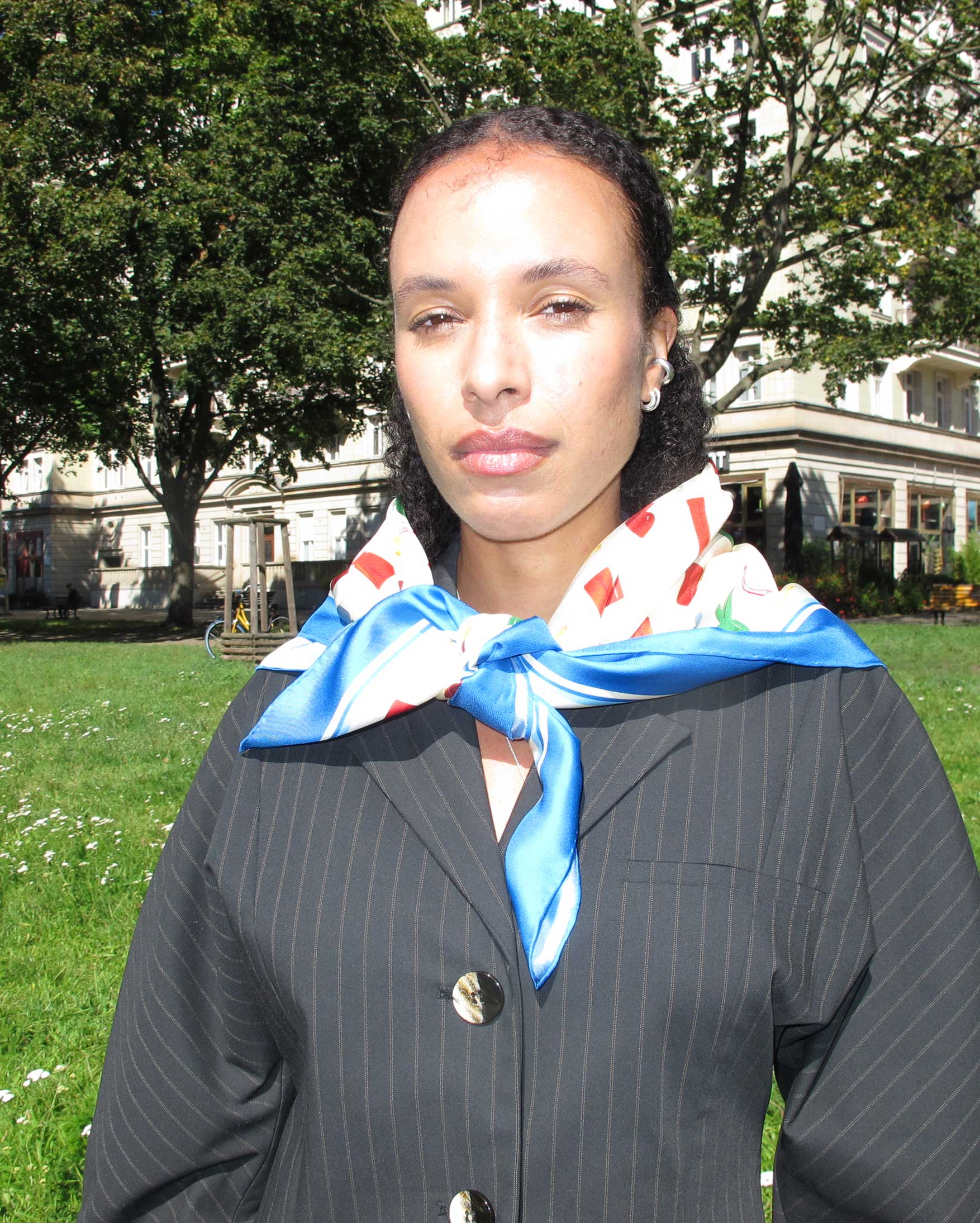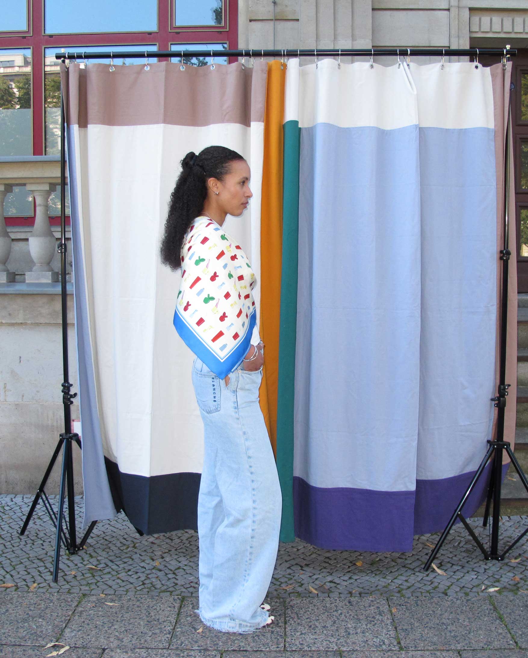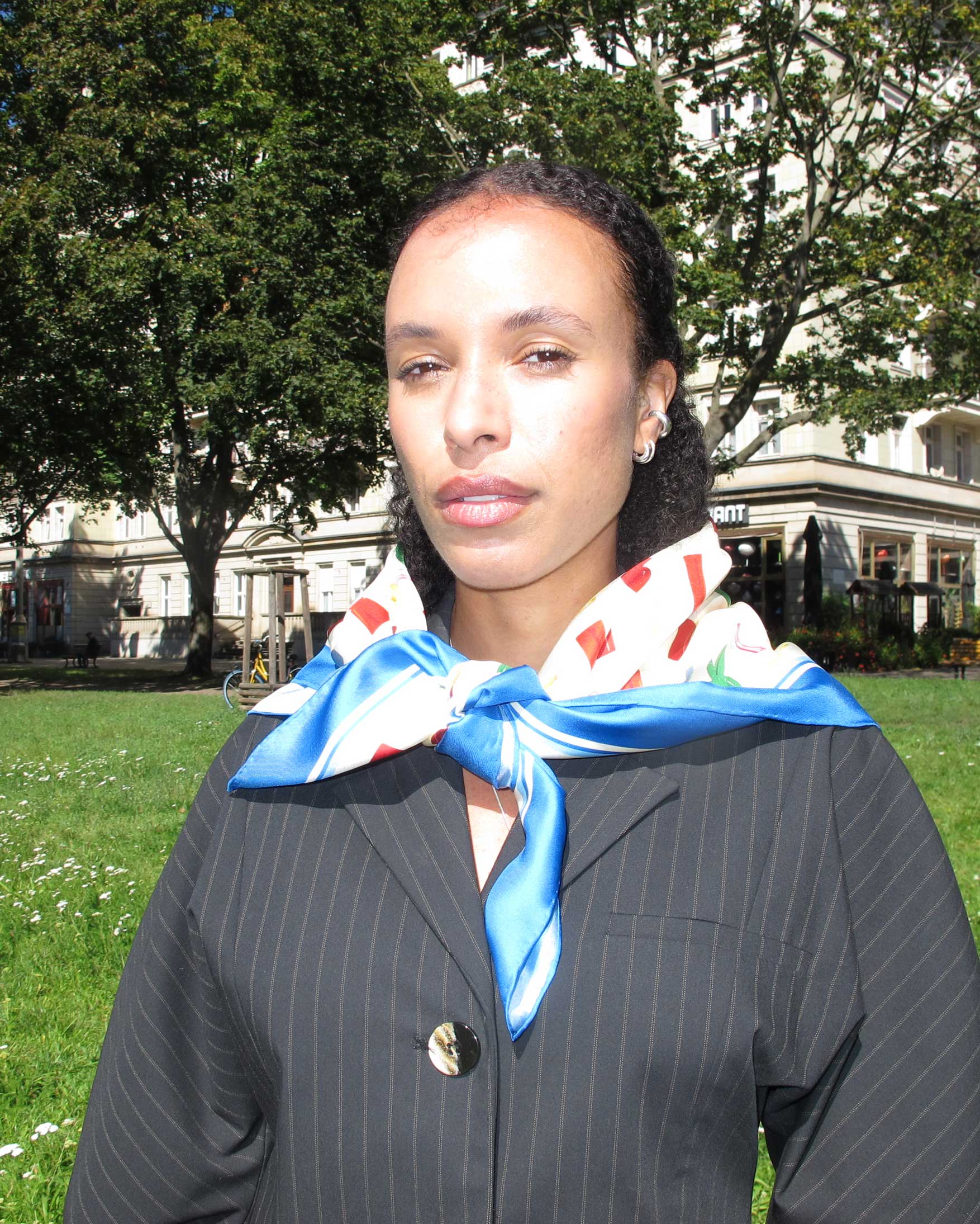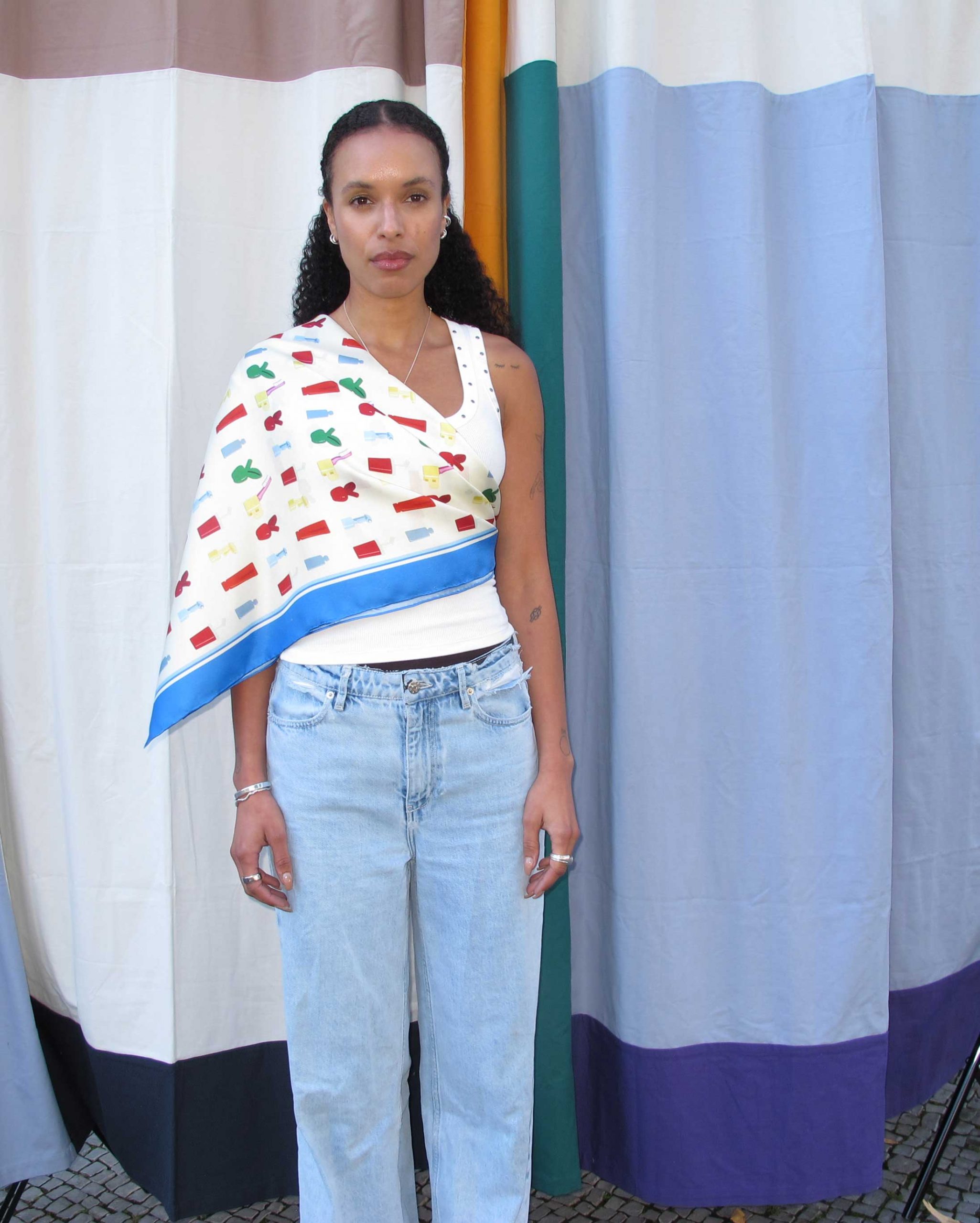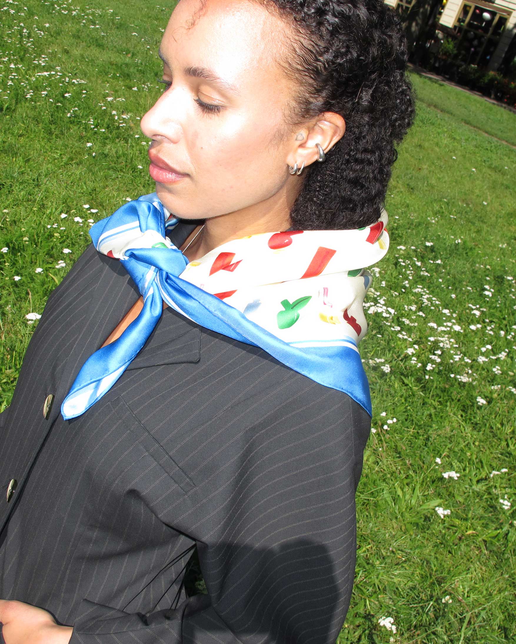 “Square 90×90” is a rectangular silk scarf made of silk twill featuring the Large Blue Plastic Toys print.