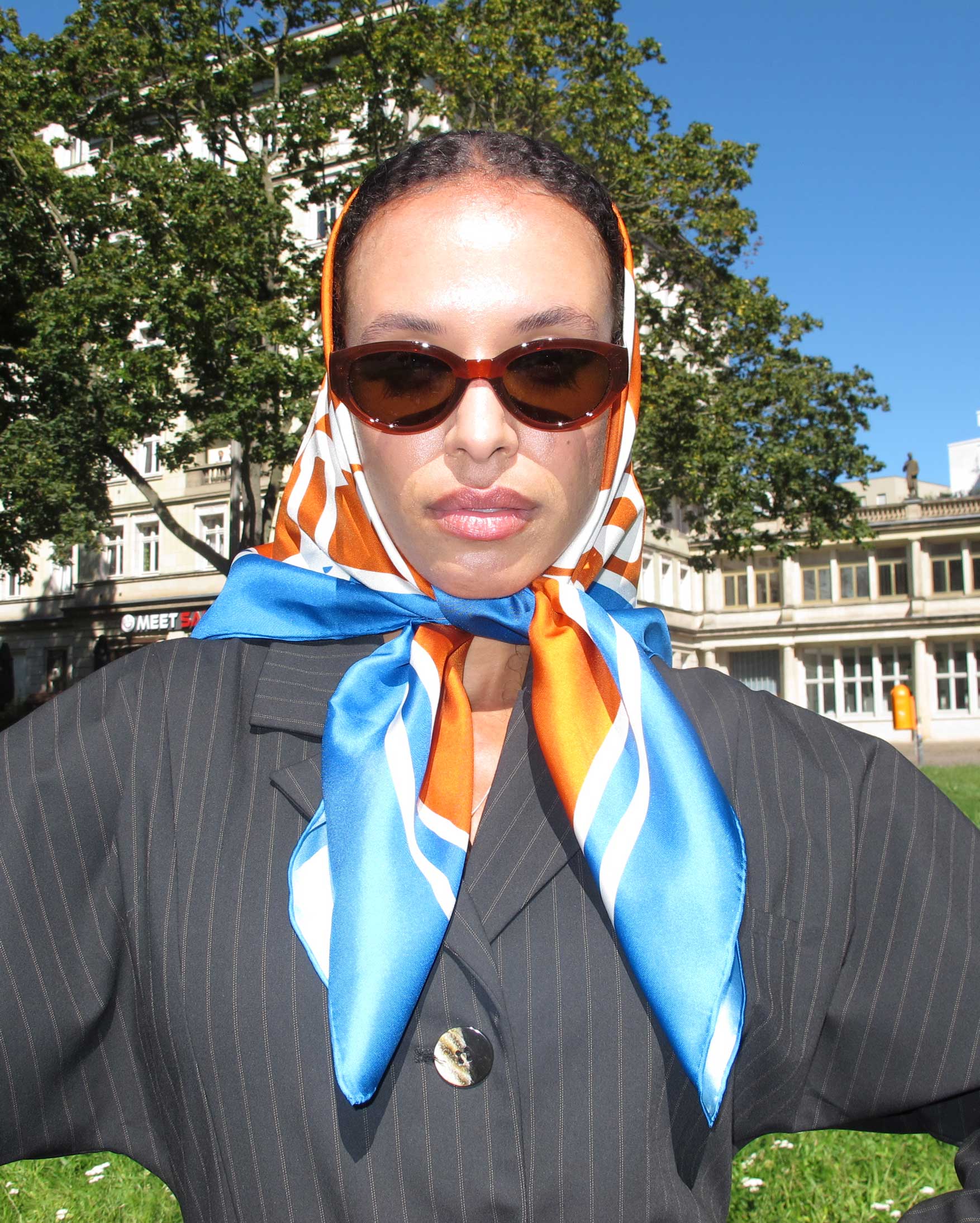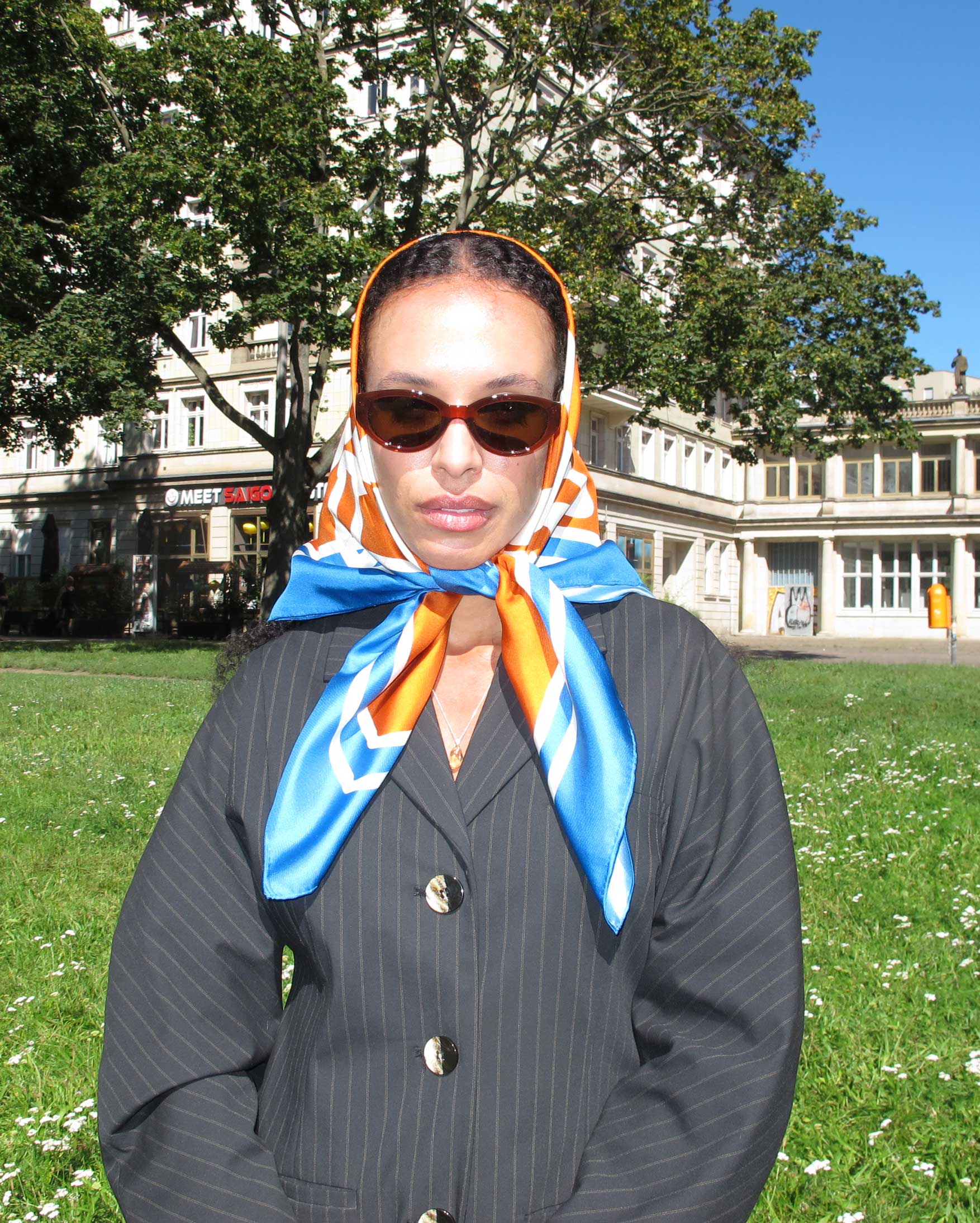 “Square 90×90” is a rectangular silk scarf made of silk twill featuring the Large Orange Fingermonster print.