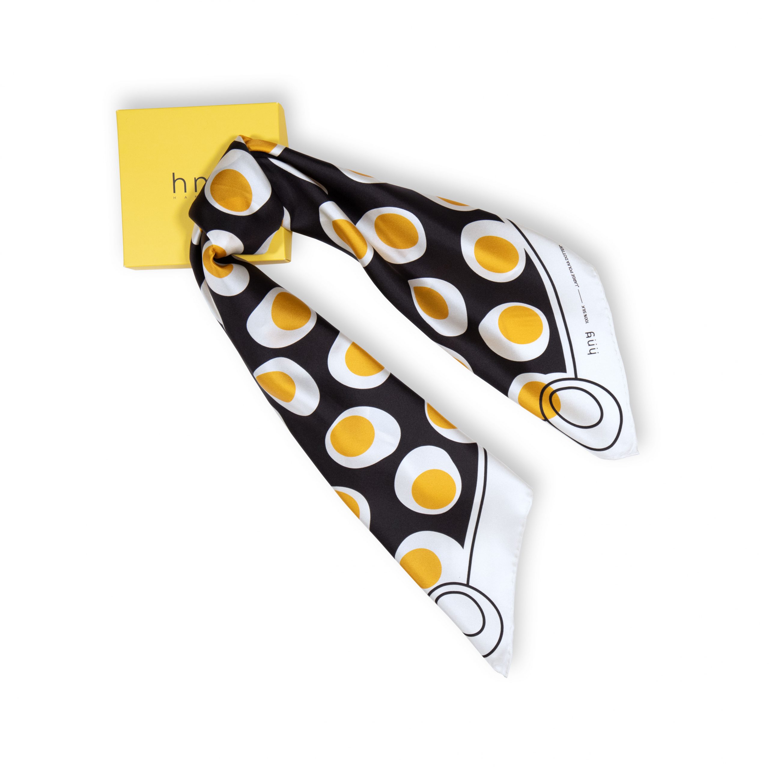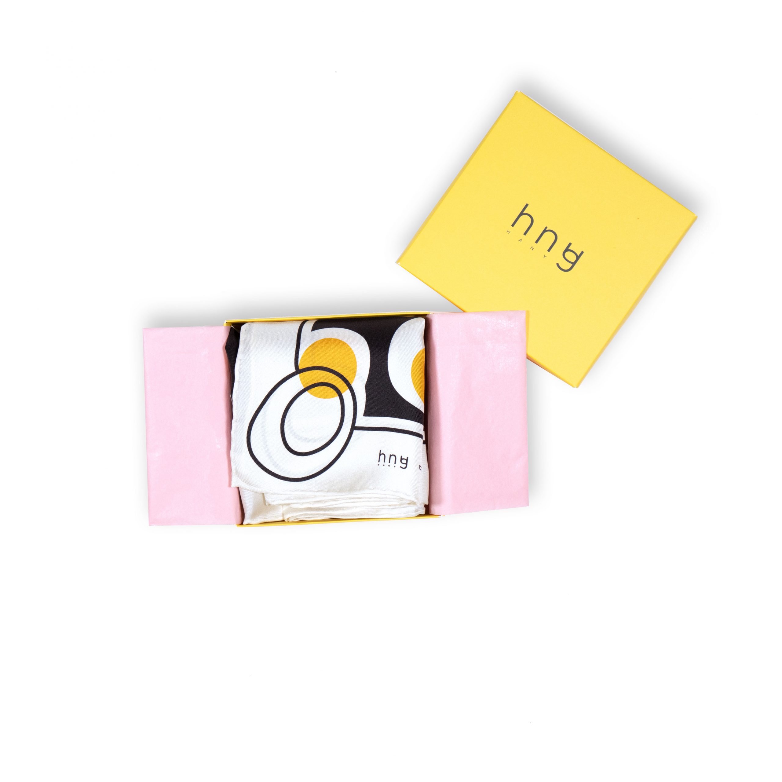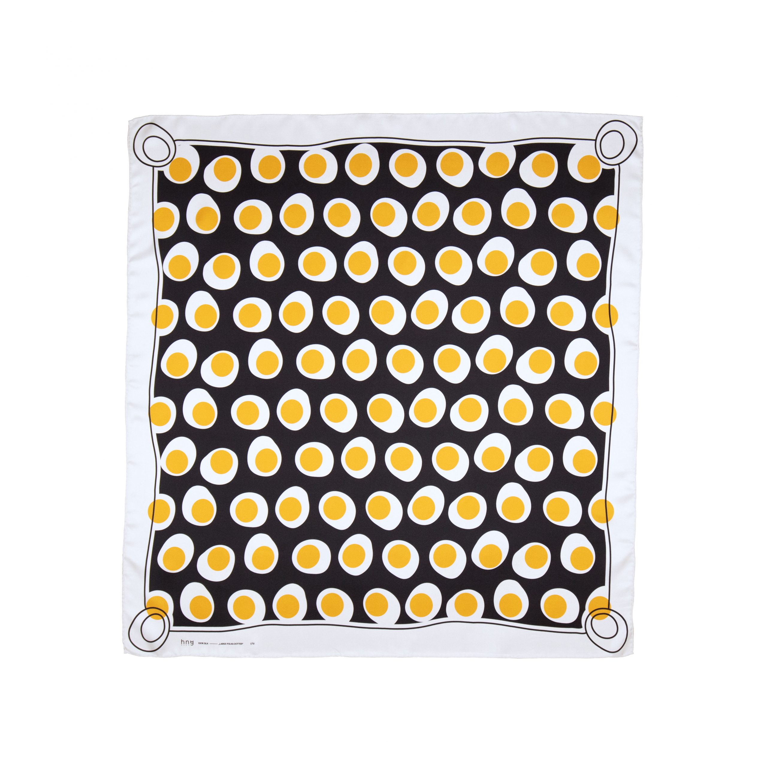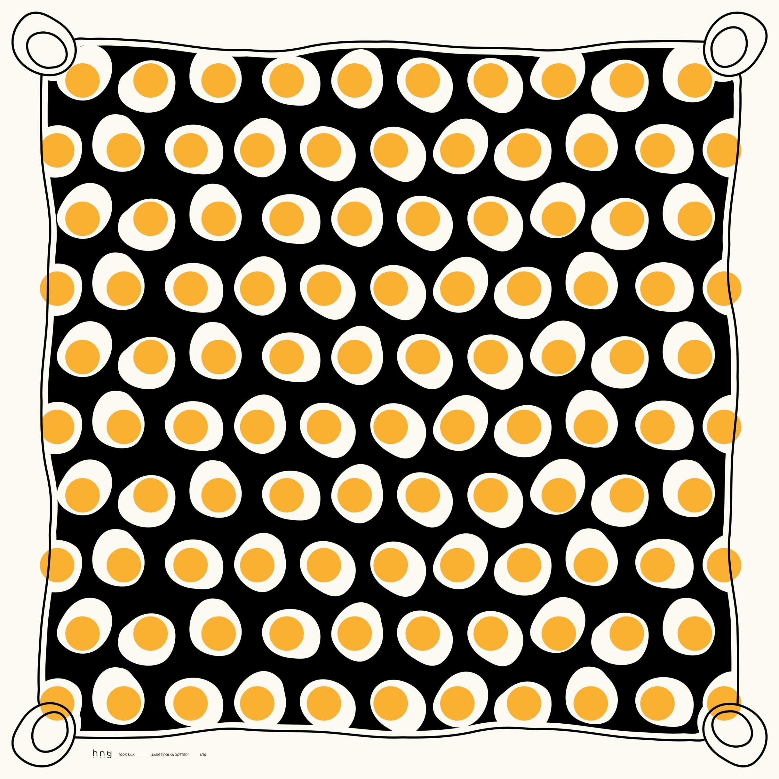 “Square 90×90” is a rectangular silk scarf made of 100% silk twill featuring the Large Polka Dotter print.