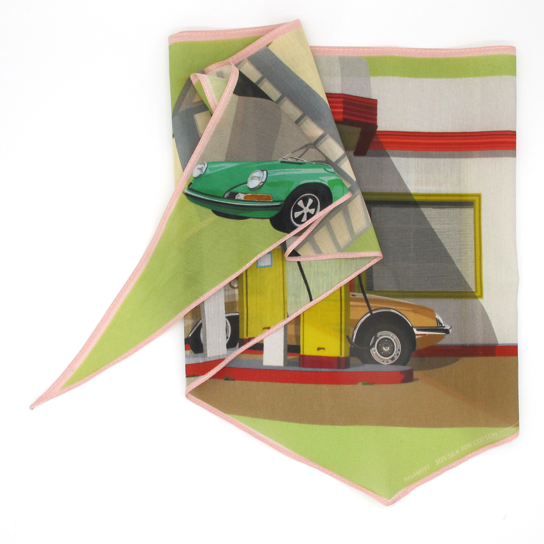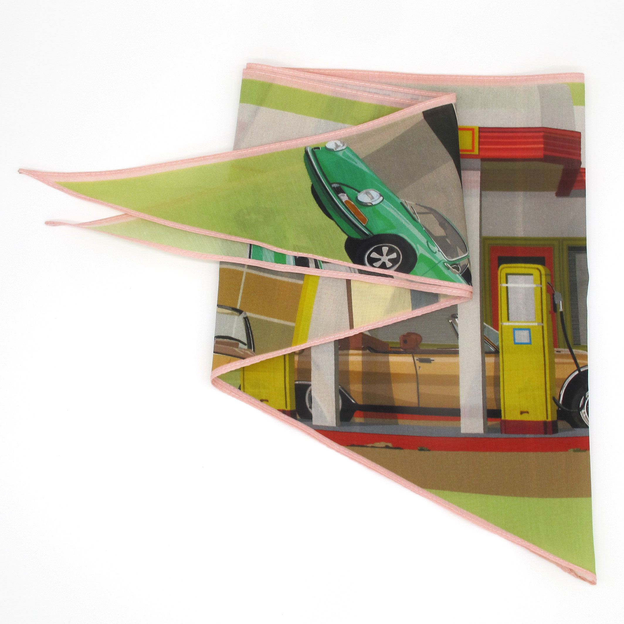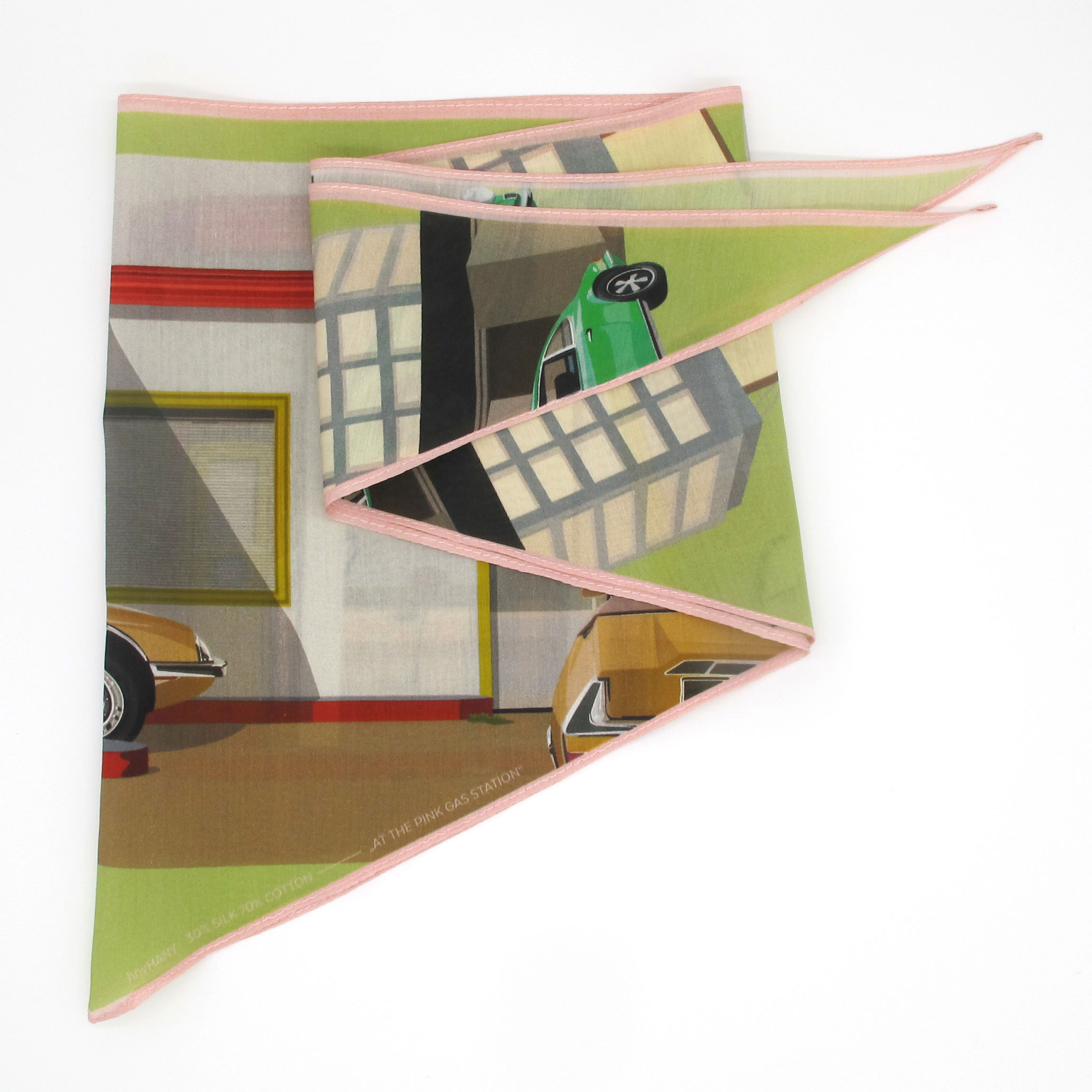 “Triangle” scarf is made of a super soft and light silk and cotton blend featuring the At The Pink Gas Station print.