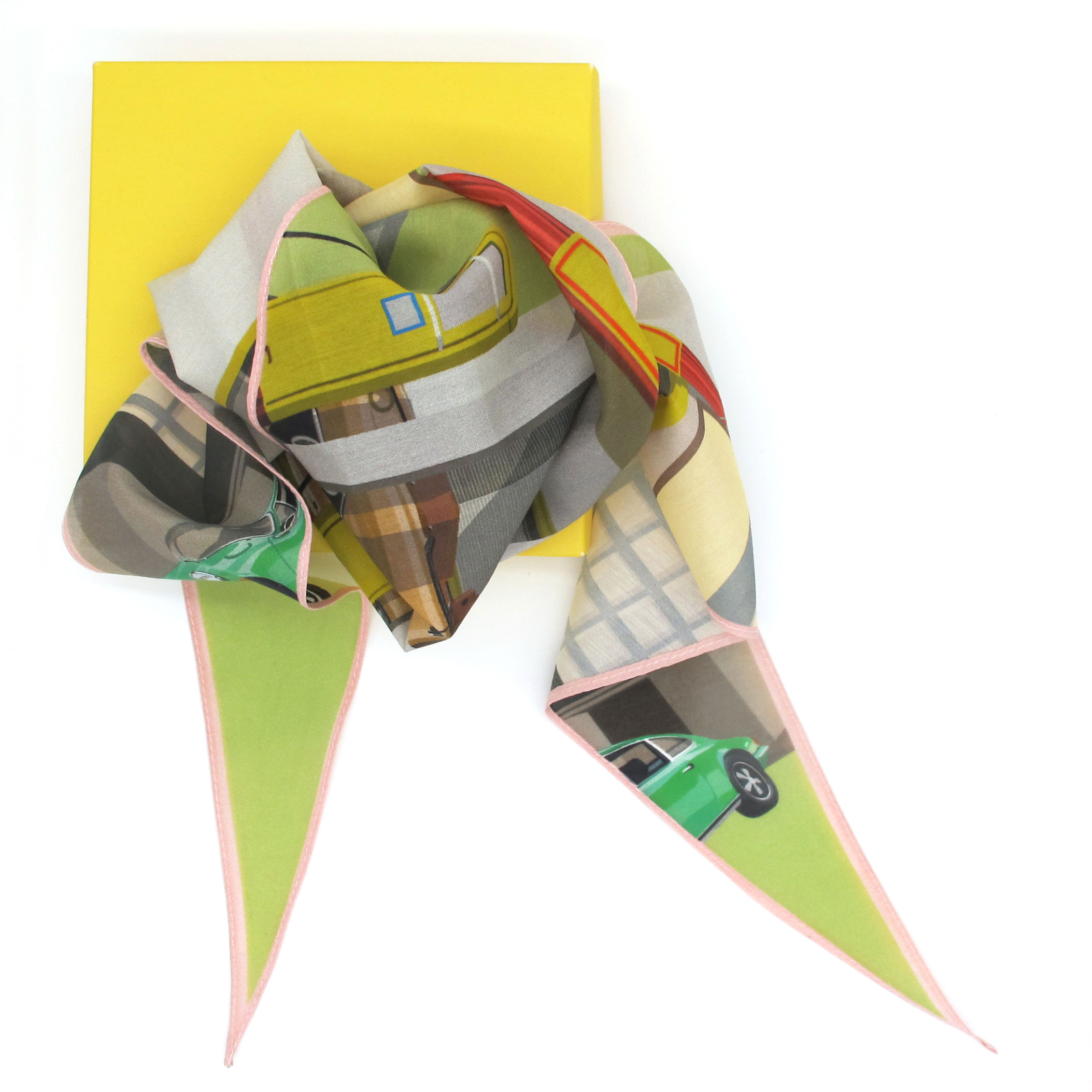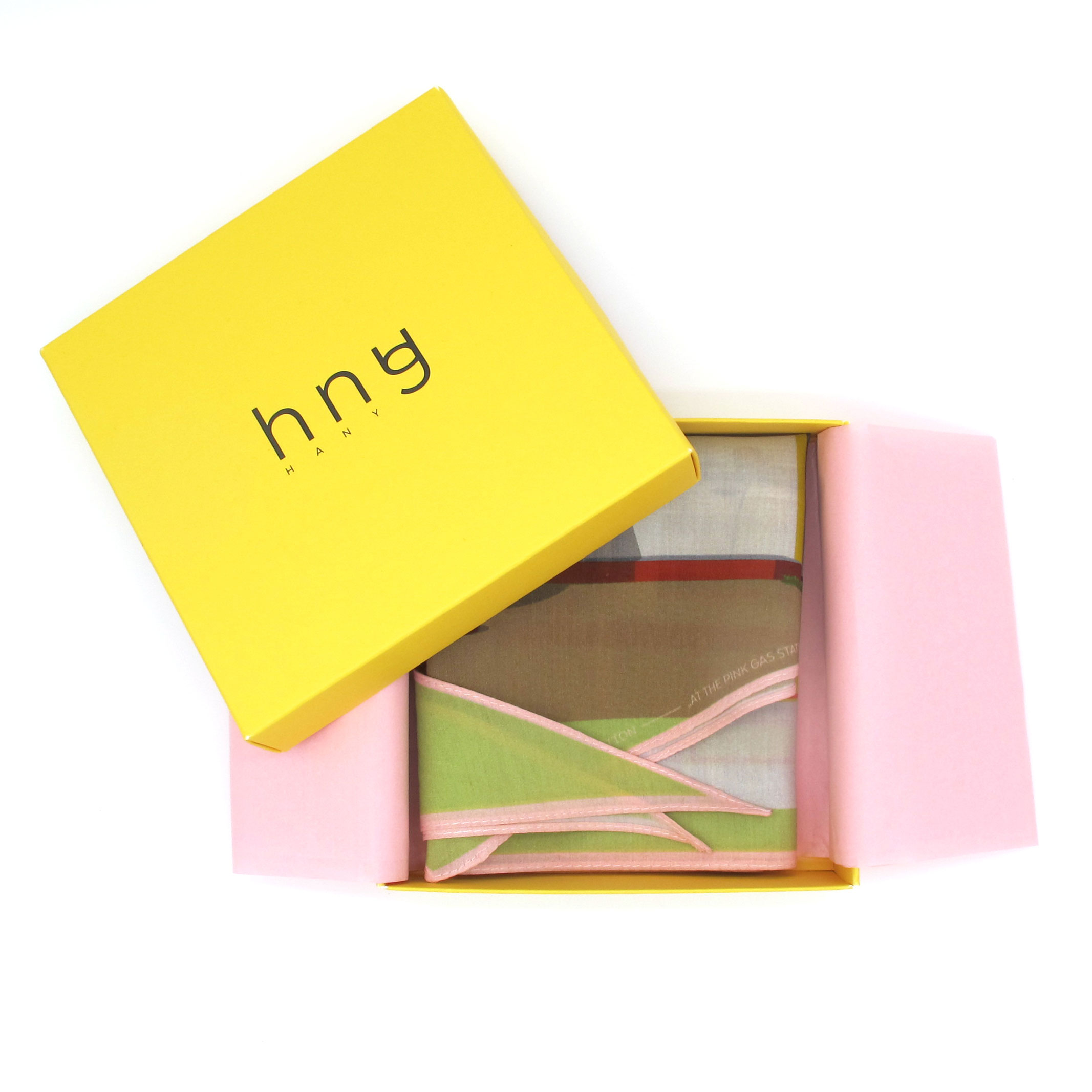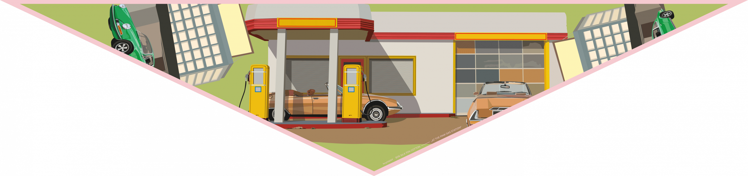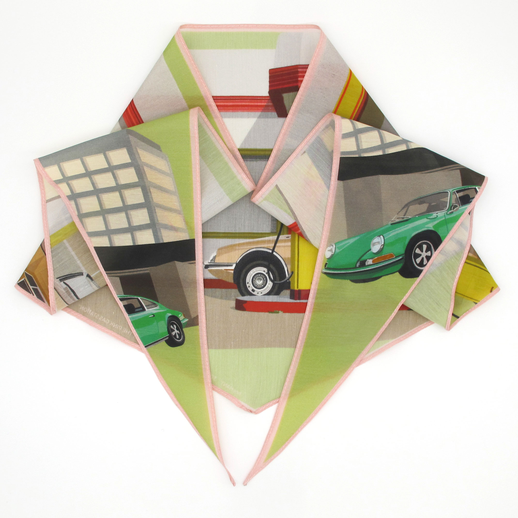 “Triangle” scarf is made of a super soft and light silk and cotton blend featuring the At The Pink Gas Station print.